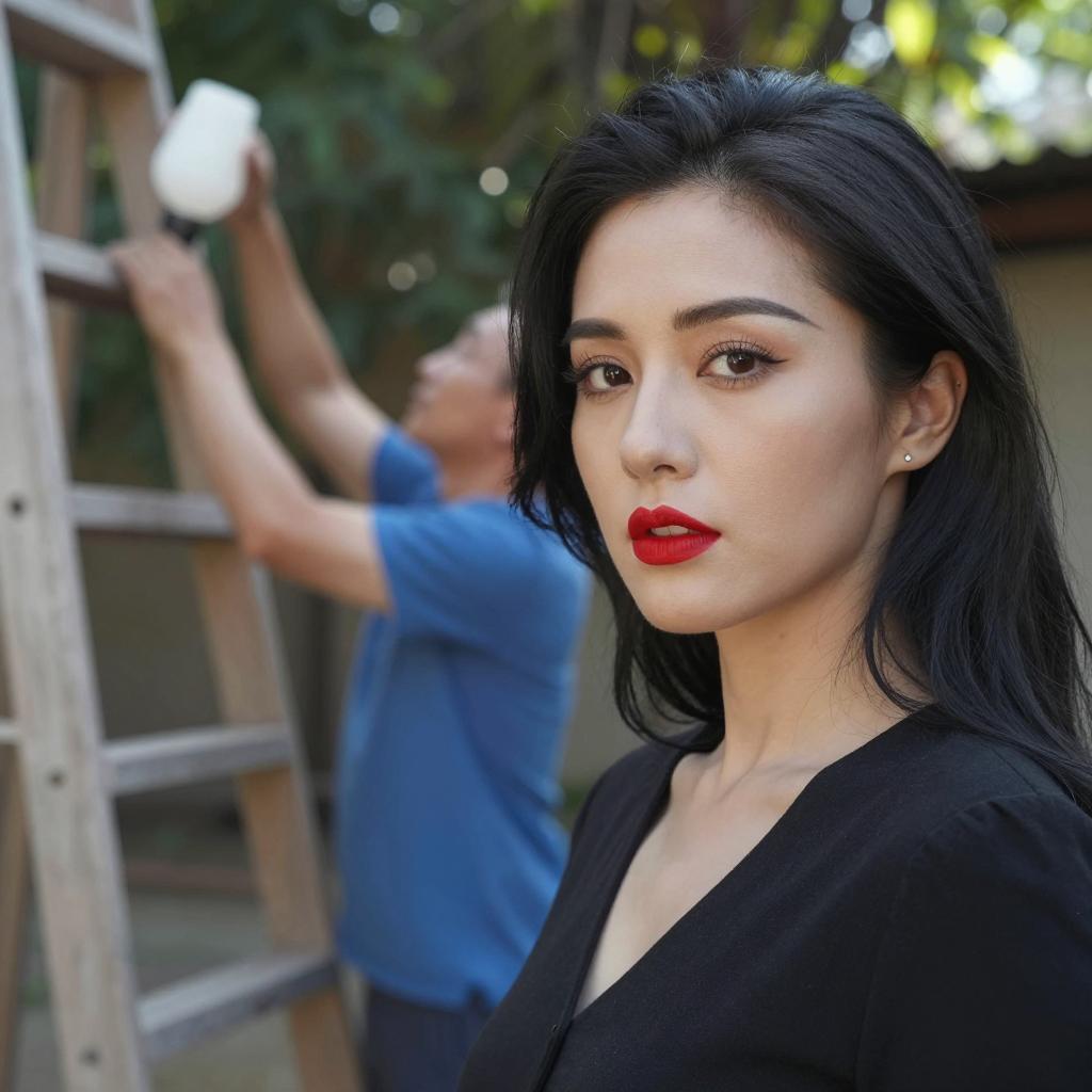 Woman with black hair, heavy makeup, red lipstick, and black top, stands in foreground, looking to the side. Background: man in blue shirt, holding white lamp, working near wooden ladder, sunlight filtering through trees.