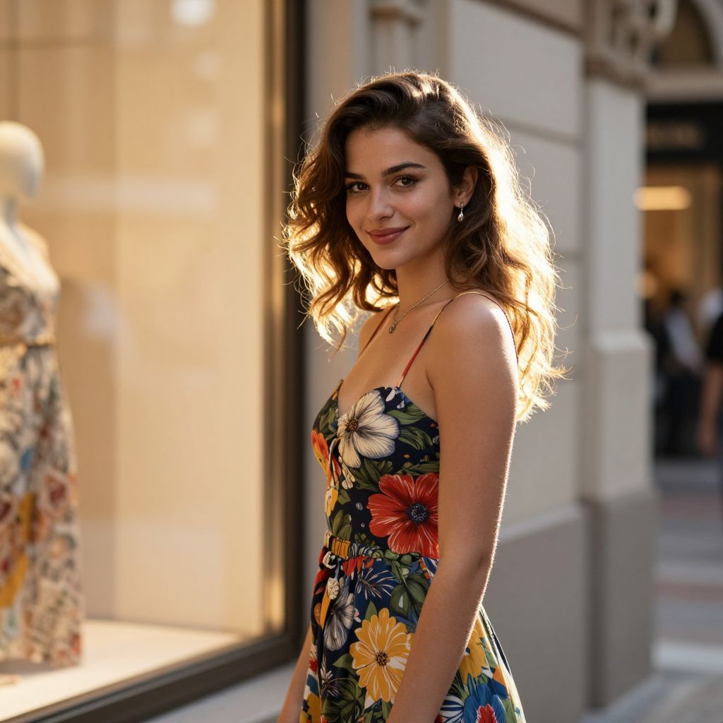 A beautiful young woman with a coy flirty smile, wearing a sun dress with large flowers, window shopping in Salita Serbelloni in Bellagio, Italy, during golden hour, backlit with a rim light, facing the camera with a small catchlight, and an exquisite detail.