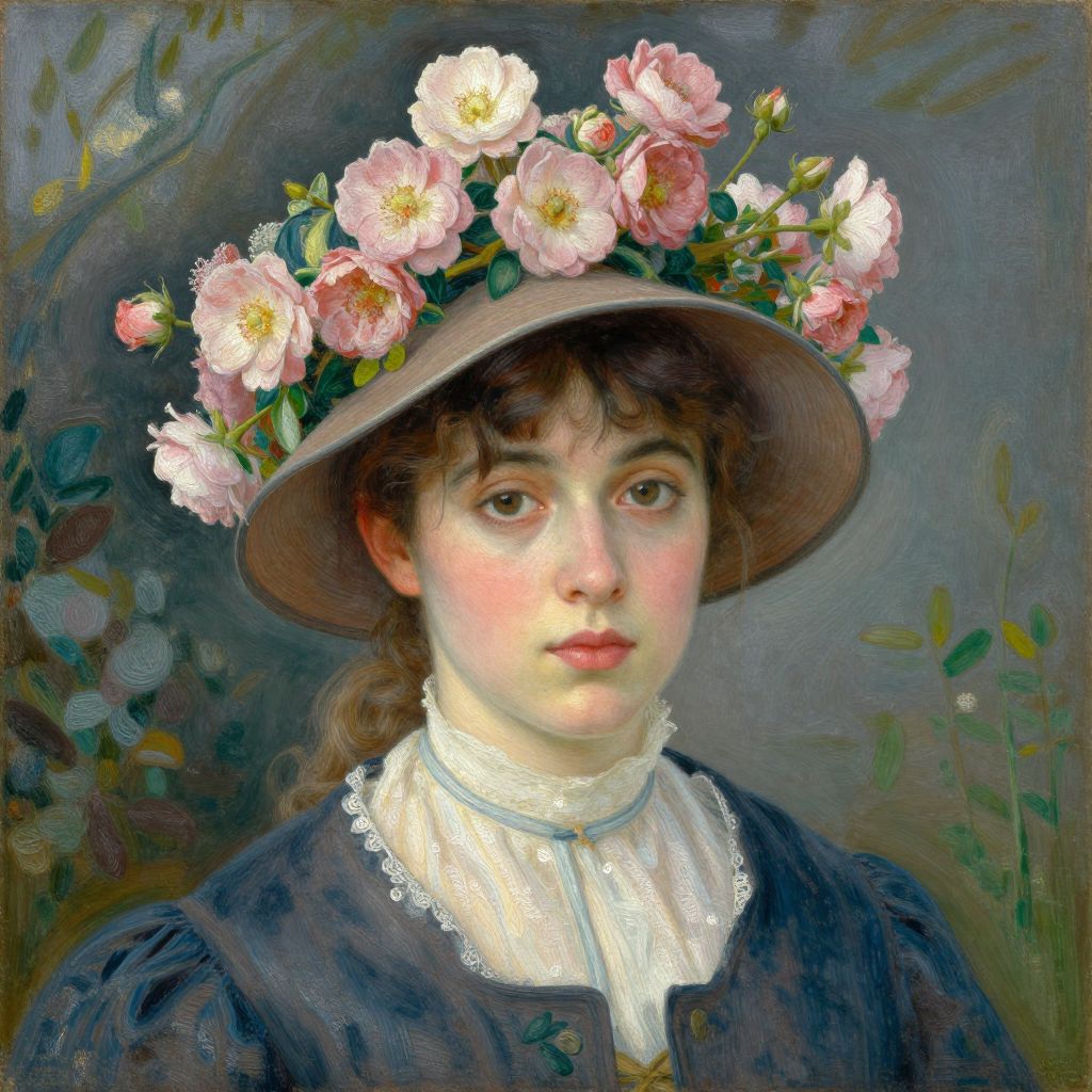 This is a digital painting of a young woman with fair skin and brown eyes, wearing a large, brown, wide-brimmed hat adorned with a wreath of pink and white flowers. She has dark brown, wavy hair peeking out from under the hat. She wears a dark blue, Victorian-style dress with a high, white lace collar. The background is a blurred mix of green and brown tones, with hints of floral patterns. The painting has a realistic yet slightly impressionistic style, with smooth, blended brushstrokes and a soft focus on the subject's face. The woman's expression is calm and slightly serious.