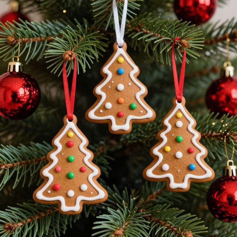Gingerbread Christmas tree ornaments, intricately decorated with white icing outlines and colorful candy dots, hang gracefully among vibrant green pine branches and festive red baubles, creating a warm and inviting holiday scene.