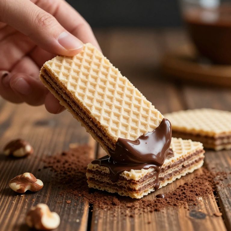 Wafer held delicately by a hand, partially dipped in melted dark chocolate, fine textures visible on crispy layers, surrounded by scattered nuts and cocoa powder on a rustic wooden table, warm ambient lighting creating a cozy atmosphere, macro shot style
