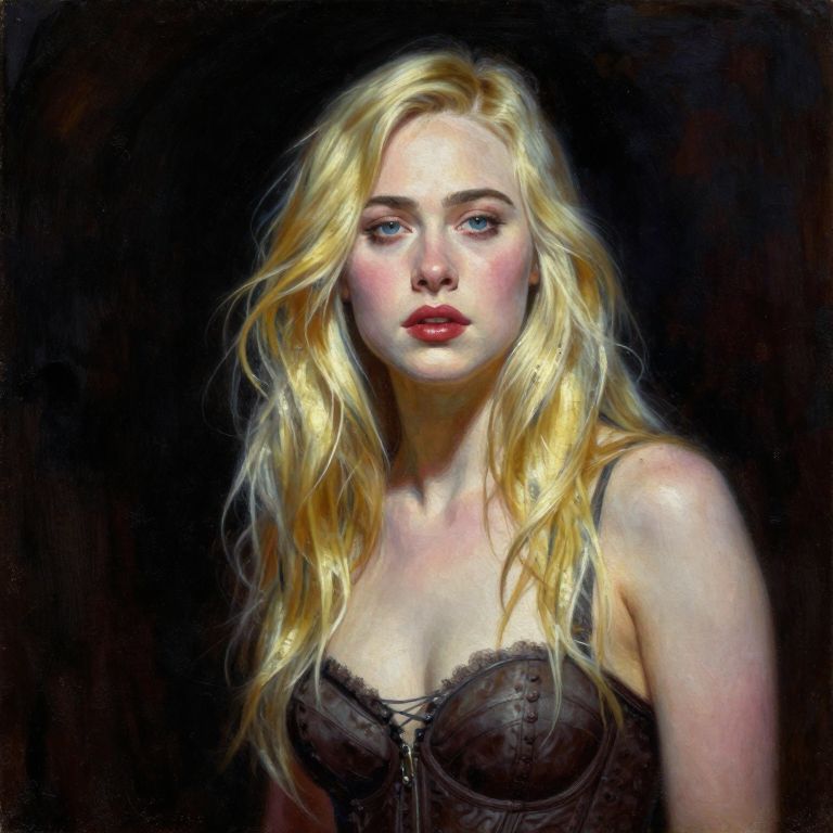 Ultra realistic extremely detailed elle fanning in prey, art by frank frazetta and michael sowa, roger deakin � s cinematography, oil on canvas, 4 k, ultra realistic, highly detailed, epic lighting