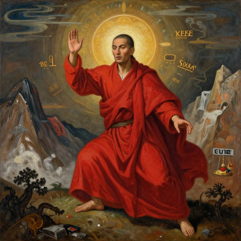 Consciousness red robed figure using words of power to destroy a mountain, oil painting, religious art,