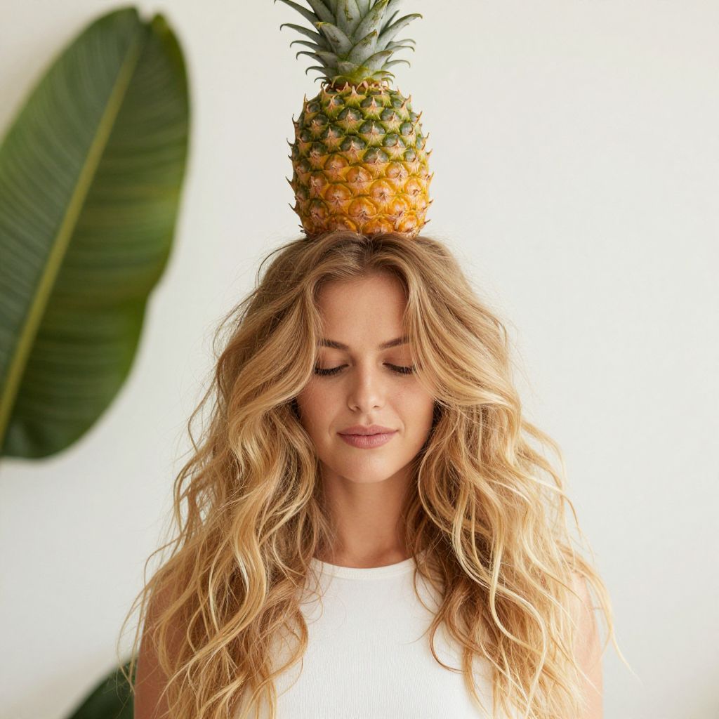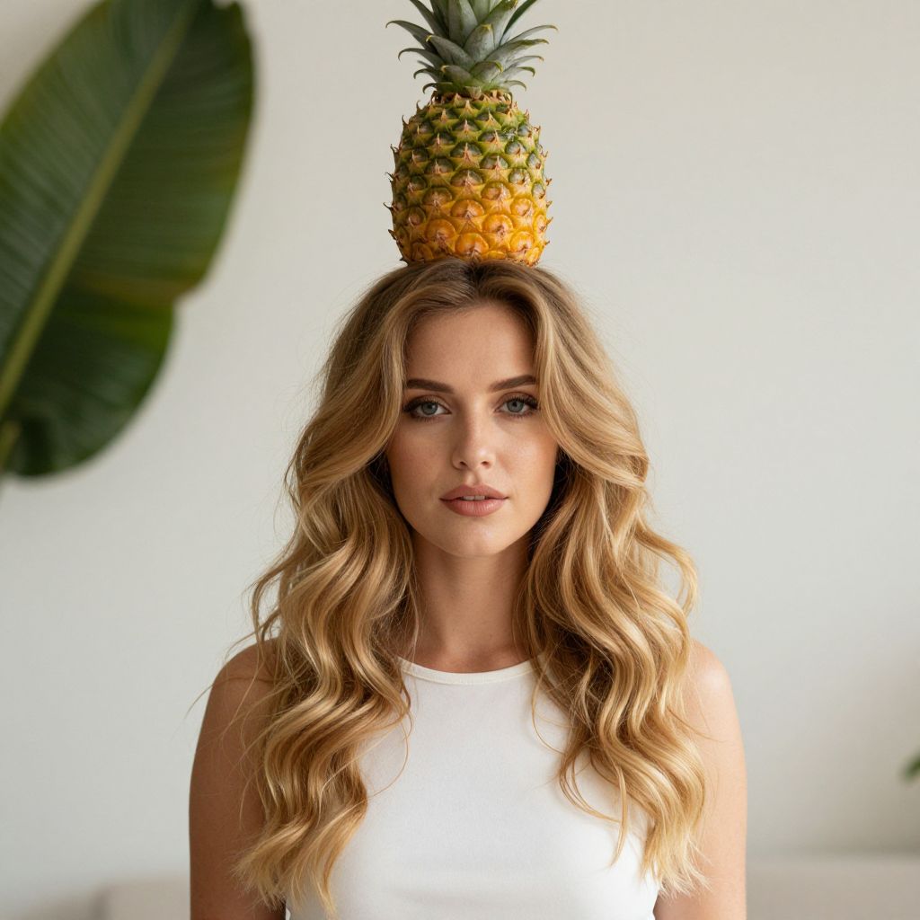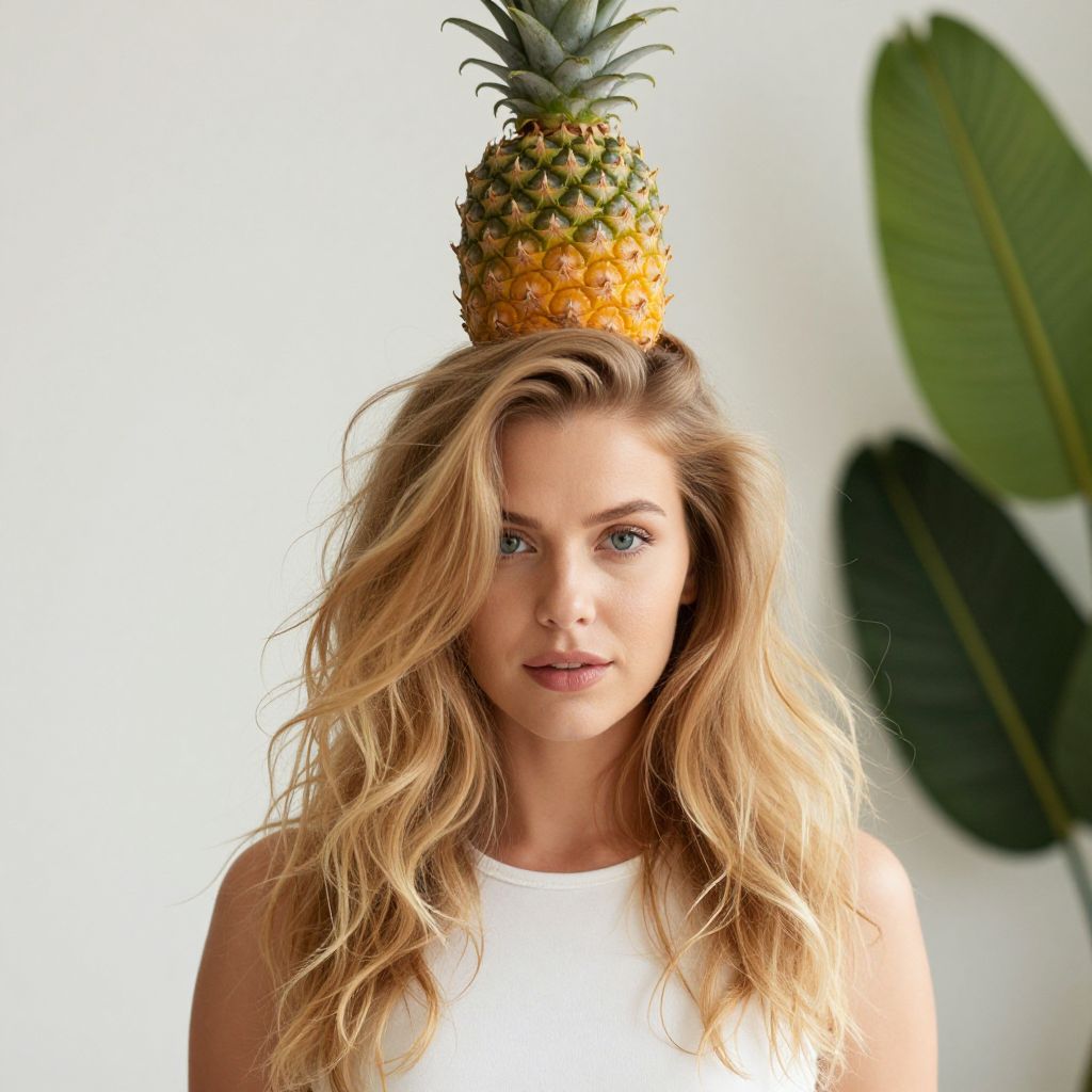 Woman modeling a vibrant tropical look with a fresh pineapple perched atop her cascading, softly tousled blonde hair, complemented by a minimalist white top and a serene indoor setting featuring a blurred green leaf in the background.