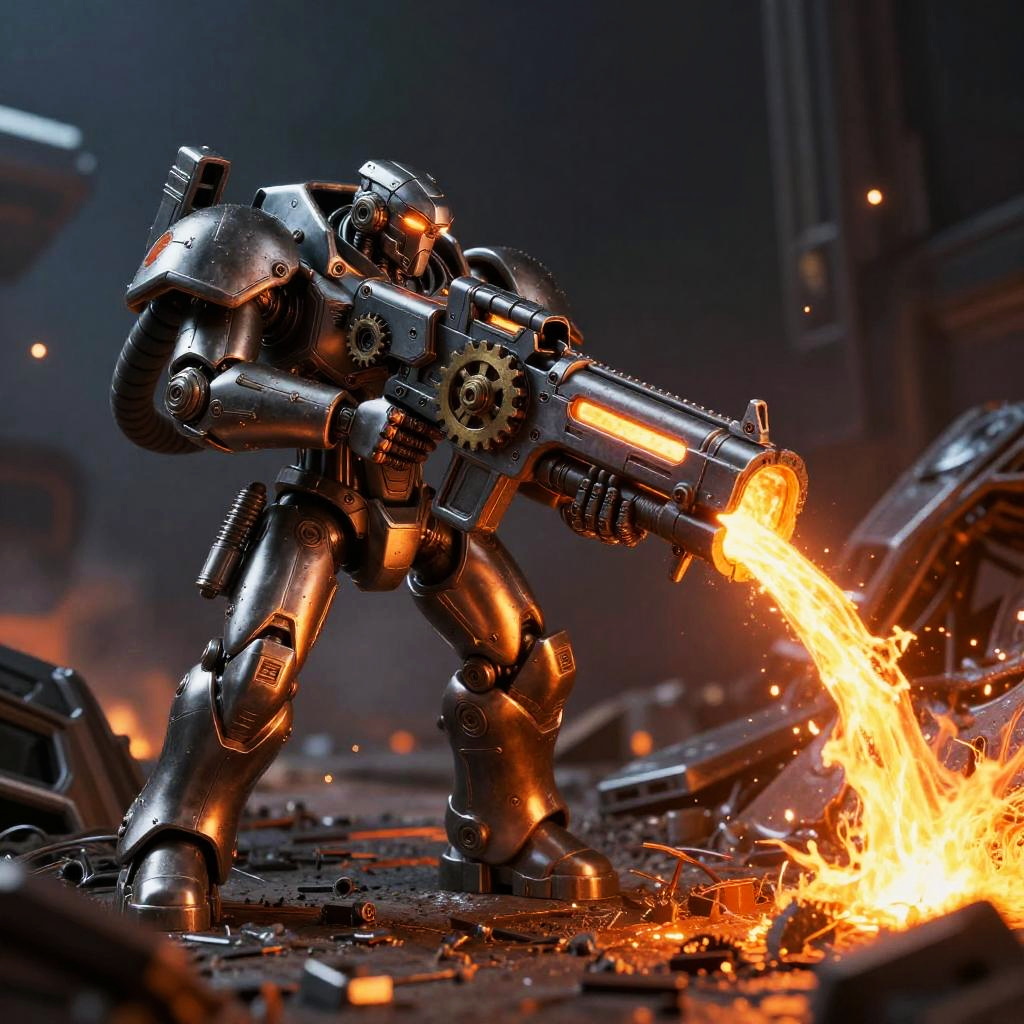 Meltagun sci-fi heavy weapon, worn metallic textures, emitting bright molten streams, detailed cogwheels and tubes, cybernetic soldier holding weapon, fiery glow illuminating dark battlefield, futuristic warzone with sparks and molten metal effects