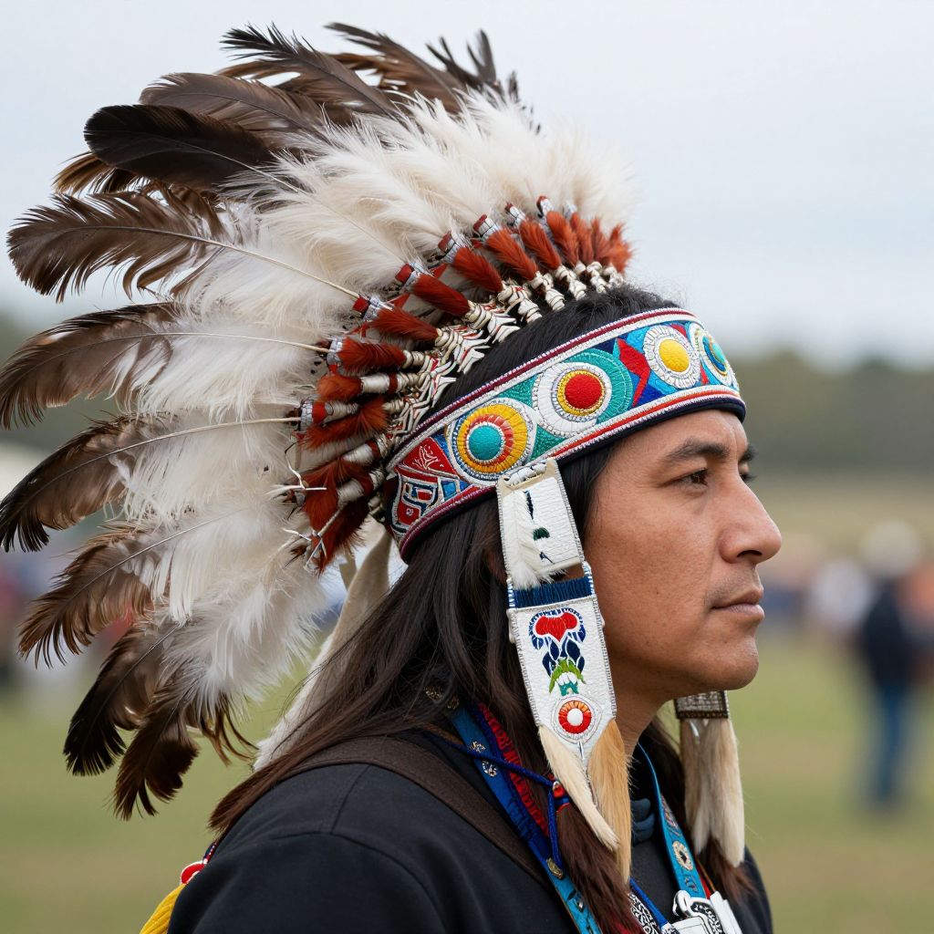 Photograph of a Native American man in profile, wearing a traditional headdress adorned with white, black, and red feathers, intricate beadwork, and colorful circular patterns. He has long black hair, a medium-brown complexion, and a serious expression. He is dressed in a black shirt with a blue and red patterned necklace. The blurred background shows an outdoor setting with green grass and indistinct people. The image emphasizes cultural heritage and traditional attire.