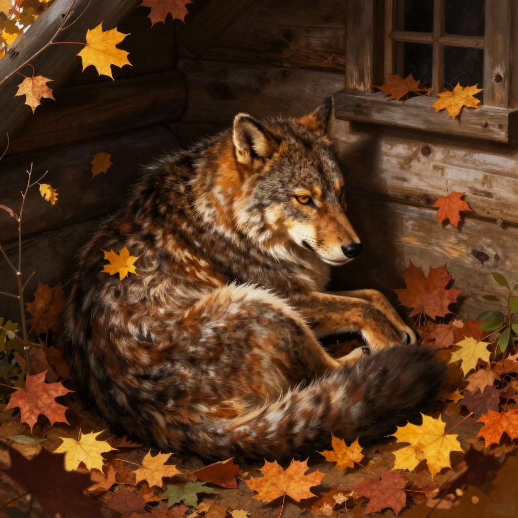 Renard curled up in a cozy autumn setting, surrounded by colorful fallen leaves, soft warm lighting, rustic cabin backdrop, highly detailed fur and peaceful expression, inviting and serene mood, digital painting.