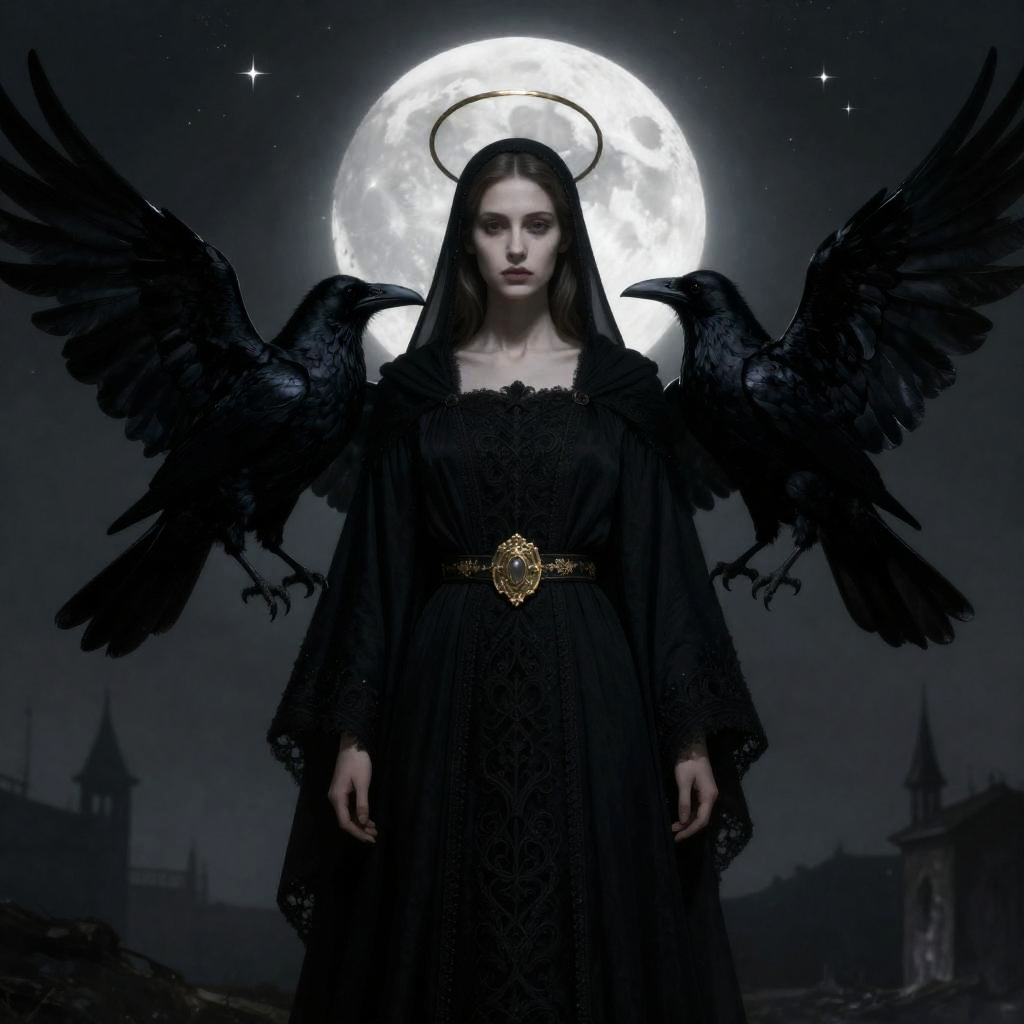 Digital art depicting a solemn woman in a black, intricately patterned robe with a gold-embellished belt. She has a halo above her head and stands against a bright full moon backdrop. Two large, black ravens with outstretched wings flank her on both sides. The scene is set in a gothic style with faint silhouettes of buildings and stars in the background, creating a mystical and celestial atmosphere.