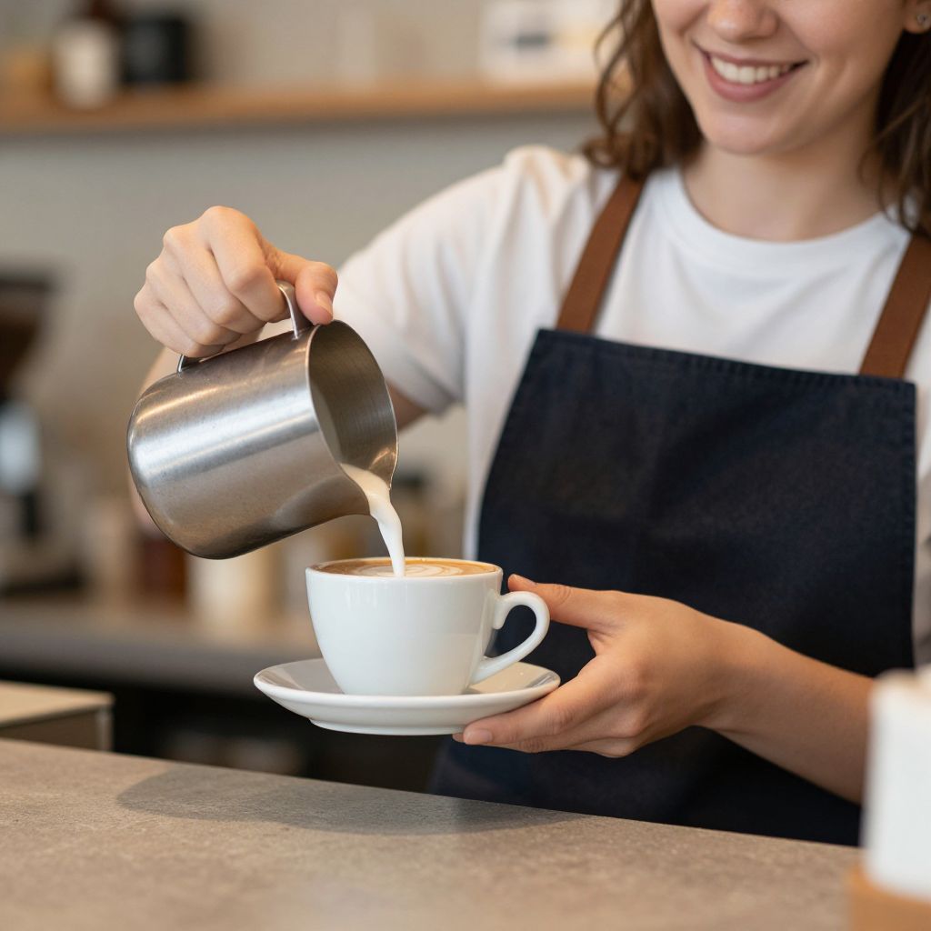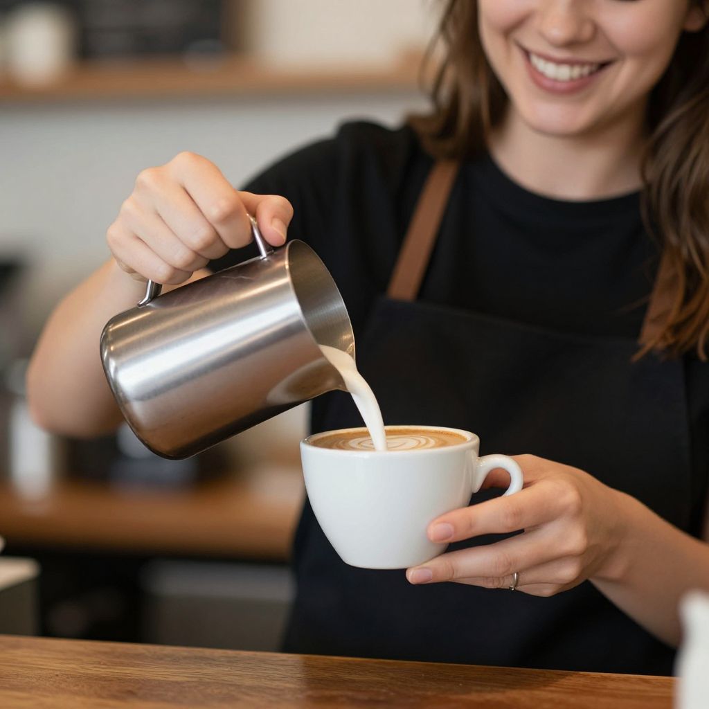 Photograph of a smiling woman with light skin and brown hair, wearing a black apron over a black shirt, pouring milk from a silver metal pitcher into a white ceramic cup. She holds the cup with her right hand, and the milk creates a patterned foam top. The background is blurred but suggests a cozy café with wooden shelves and a warm, inviting atmosphere. The image focuses on the action of pouring and the woman's joyful expression, capturing a moment of serving a beverage.