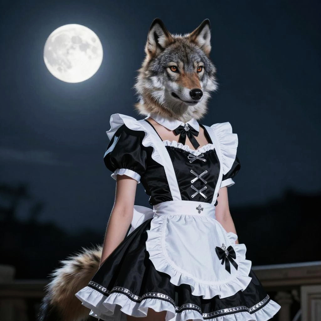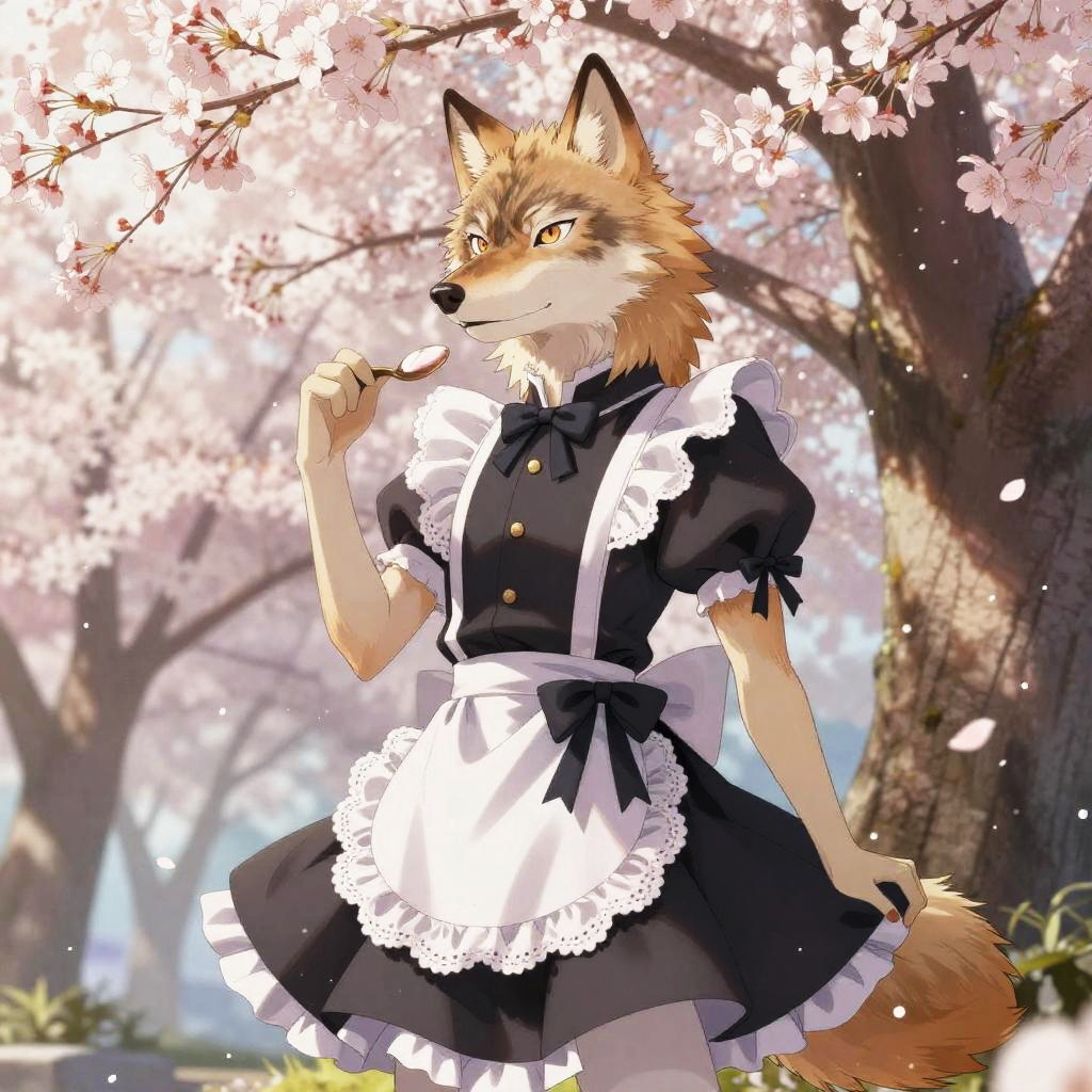 Majestic maid wolf standing under cherry blossom trees, traditional maid outfit with lace and ribbons, petals swirling around, soft sunlight, detailed anime concept art, serene expression