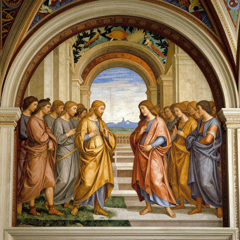The image depicts a Renaissance fresco, showcasing a group of figures in elaborate robes, engaged in a conversation within an archway. The figures are adorned in rich, flowing garments in shades of gold, orange, and brown, standing on a stone platform. The background features a vibrant, detailed mural with arches, foliage, and birds, creating a sense of depth and perspective. The fresco's colors are muted yet rich, with a dominance of earth tones that contrast with the brighter, more vivid elements of the mural. The archway framing the scene adds a sense of grandeur and enclosure, drawing the viewer's eye into the composition. The overall composition is balanced, with the figures and mural elements arranged in a harmonious manner, creating a dynamic yet serene atmosphere.