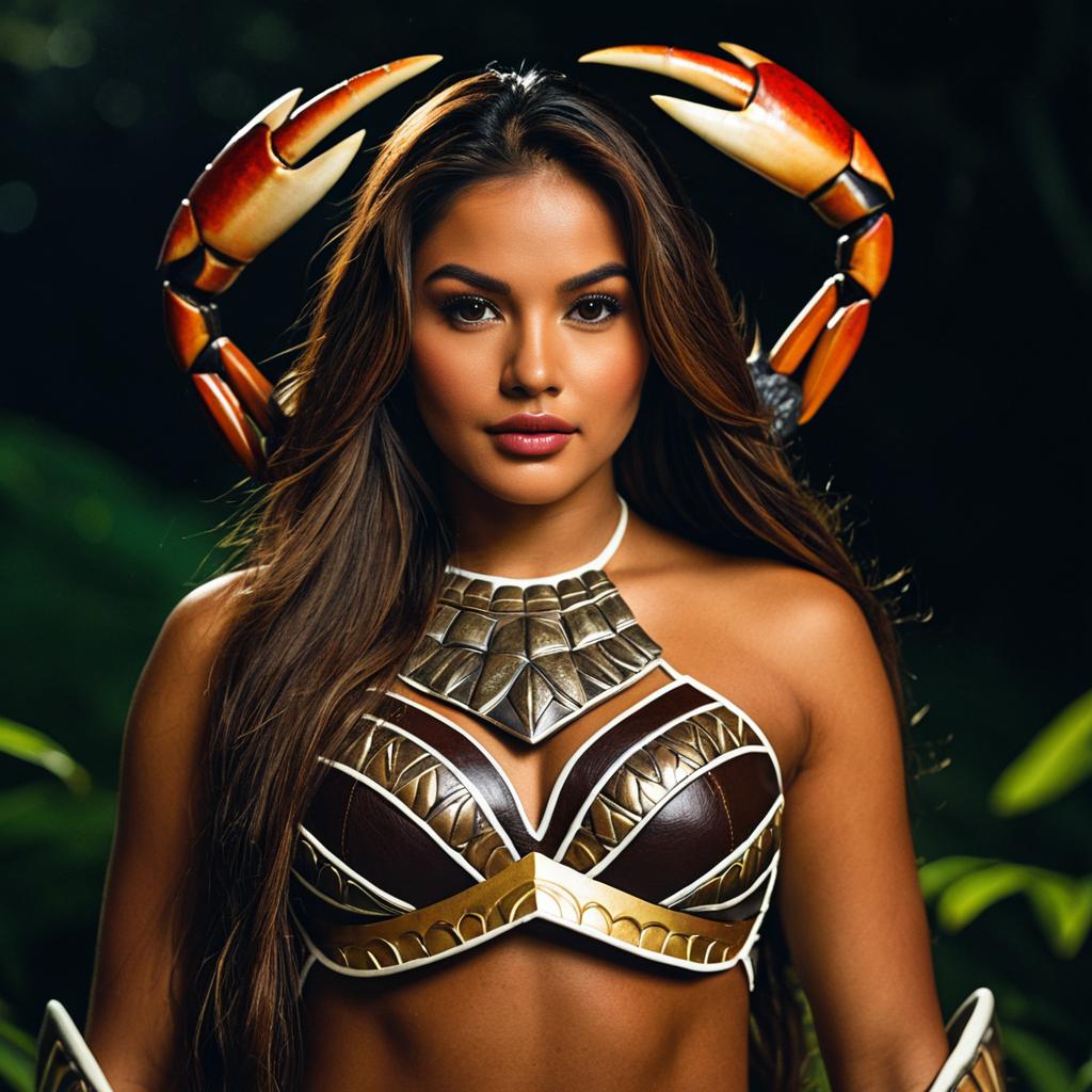 Moana crab costume ,1girl, solo, long hair, navel, brown hair, armor, midriff, looking at viewer, dark skin, brown eyes, blurry background, lips