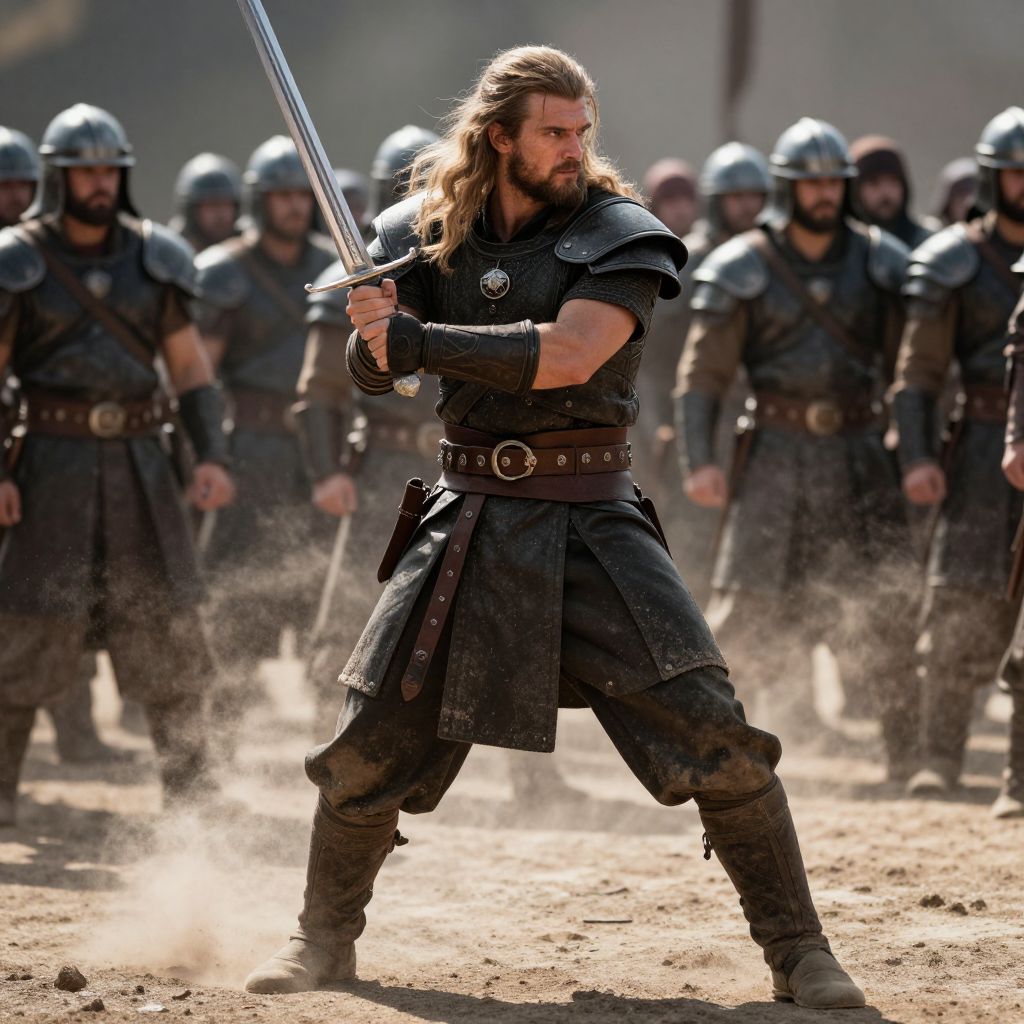 A muscular, bearded man with long blonde hair stands in a fighting stance, gripping a gleaming sword. He's wearing dark, weathered armor with leather straps and a belt, and his legs are dusted with dirt. Behind him, a blurred crowd of similarly armored fighters watches intently. The sun casts dramatic shadows, and dust kicks up around his feet, adding to the intense, action-packed scene.