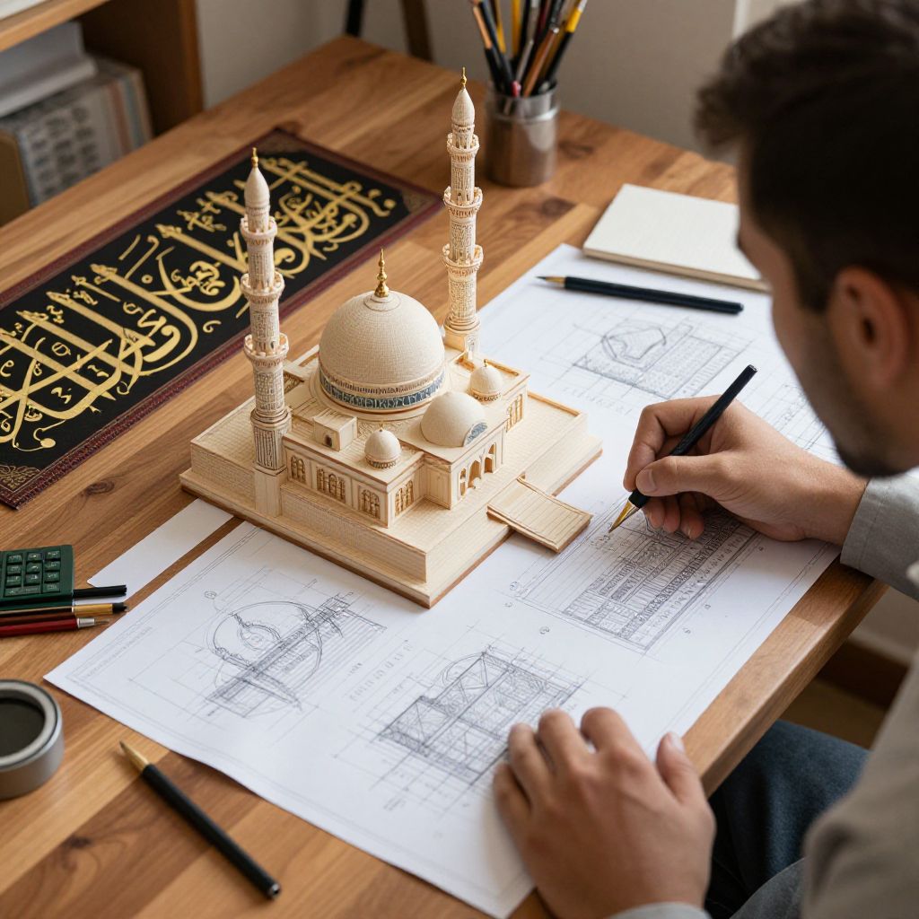 Musulman architect designing a magnificent mosque model on a wooden desk, surrounded by calligraphy tools and blueprints, Architectural sketches blending traditional Islamic design with modern elements, cozy workshop with warm lighting and detailed textures.