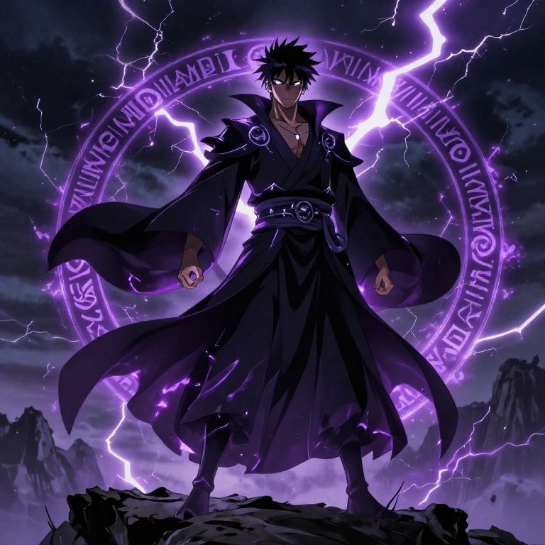 Anime-style digital artwork of a dark-haired, purple-eyed male wizard with black cloak, standing on rocky terrain, surrounded by glowing purple magic circle and lightning