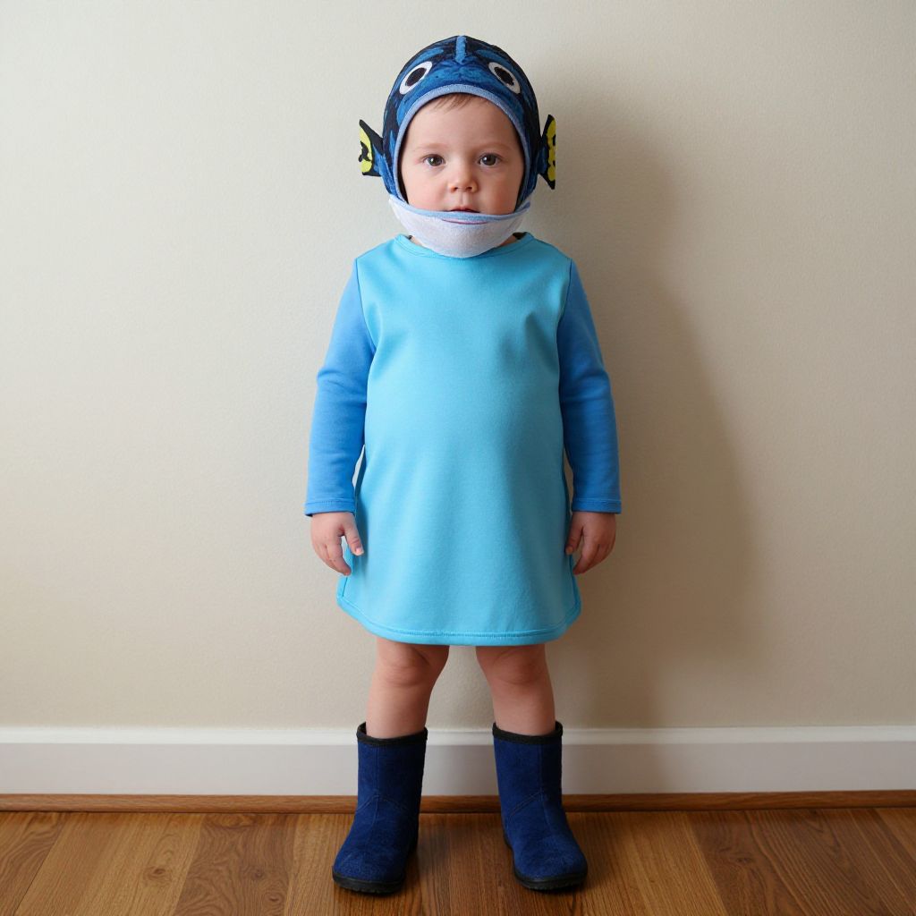 "newborn dory costume, solo, 1girl, standing, full body, long sleeves, looking at viewer, dress, parody, child, boots, closed mouth Realistic photo of casual sexy person with pretty face"