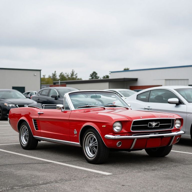 Shiny red 1967 Ford Mustang Convertible parked prominently in a lot, surrounded by modern vehicles and industrial structures under an overcast sky.
