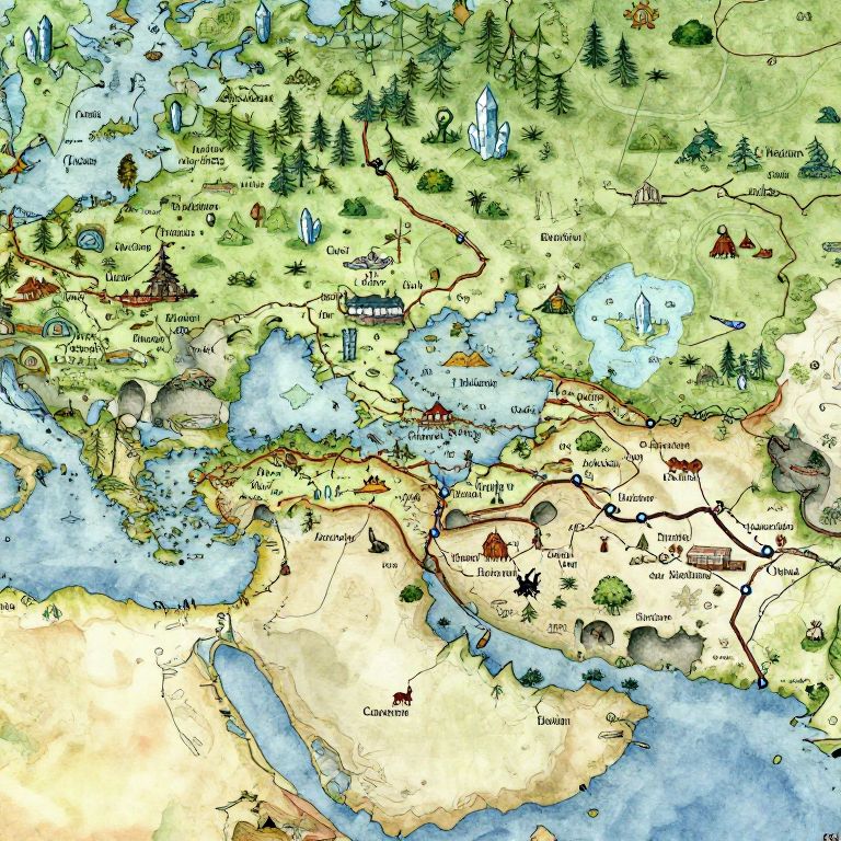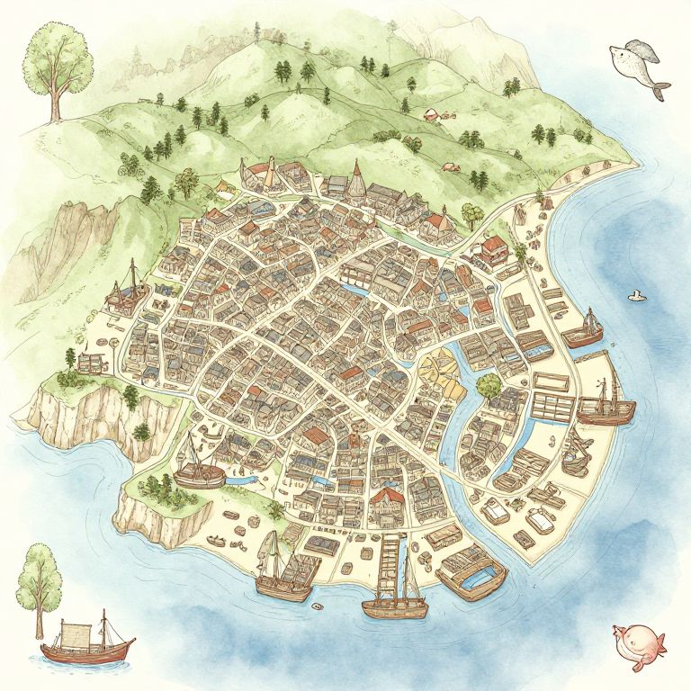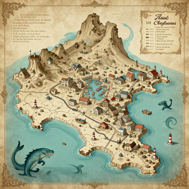 Detailed, vintage-style map illustration of a fantasy coastal island with mountains, buildings, sea creatures, and ships, featuring ornate borders.