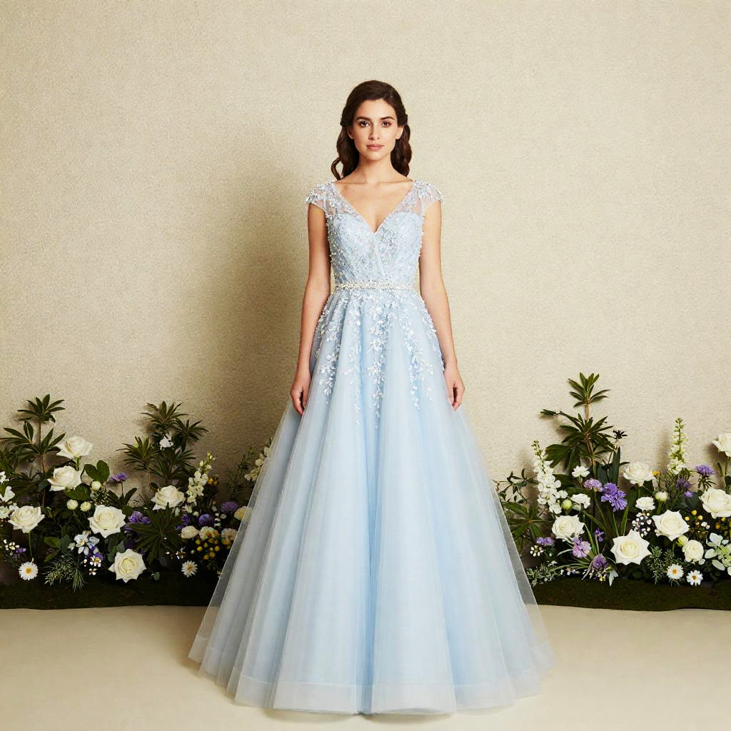 Spring Dress, a woman in a burgundy ball gown standing in front of a flower covered wall