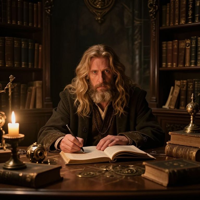Bearded man with long wavy hair wearing dark vintage clothing sitting at a wooden desk in an old library filled with antique books and mystical artifacts. Warm candlelight illuminates the room, creating a mysterious, dark fantasy atmosphere.