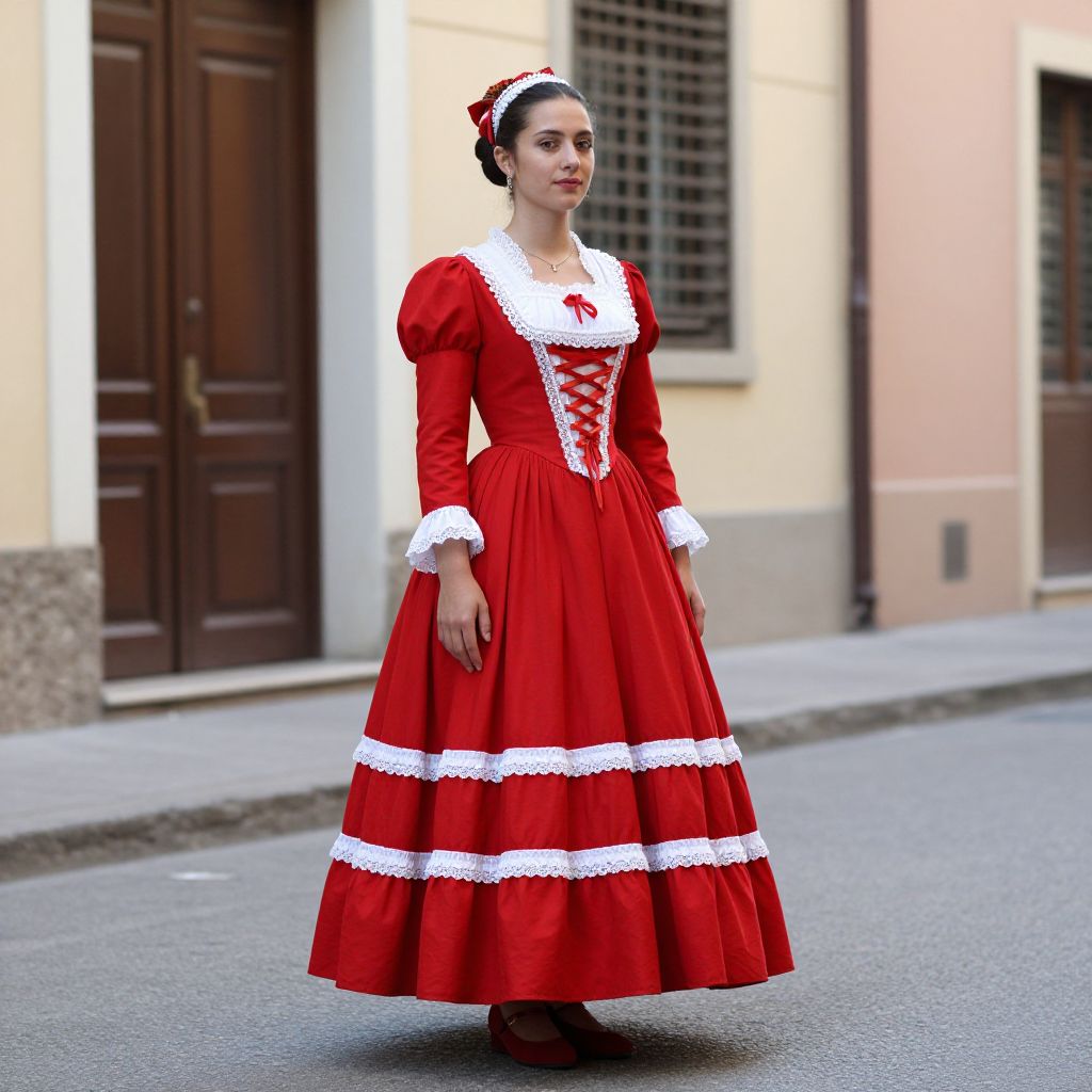 Italian dress costume, woman in red dress standing in a street with a building in the background