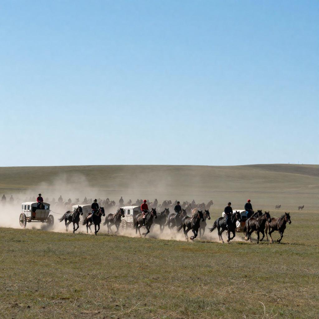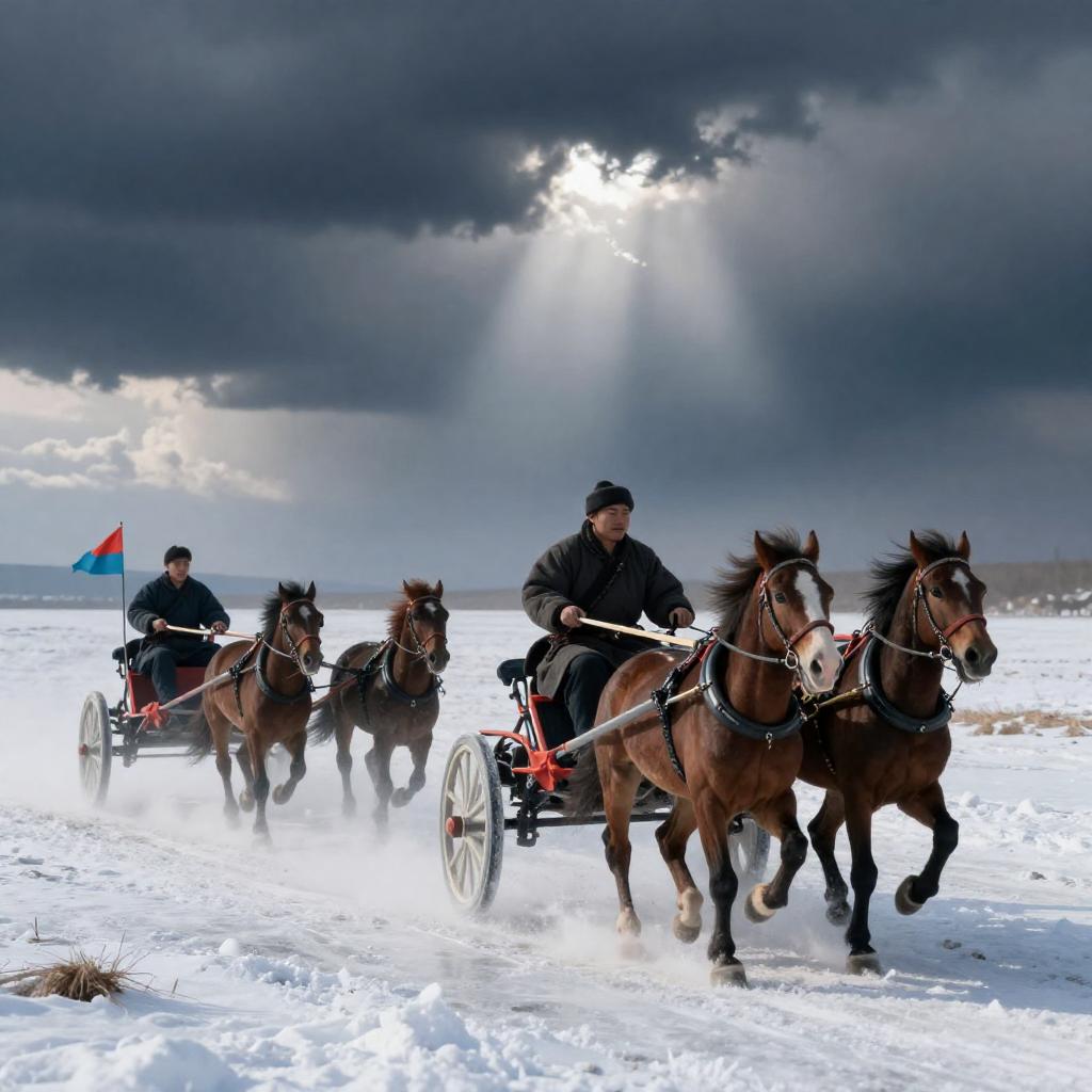Photograph of a dynamic scene with a group of horse-drawn chariots racing across a glowing, icy landscape. The horses, adorned with colorful flags, are in mid-gallop. The sky is dark and stormy, with bright white light illuminating the ice. Riders wear traditional, dark clothing.