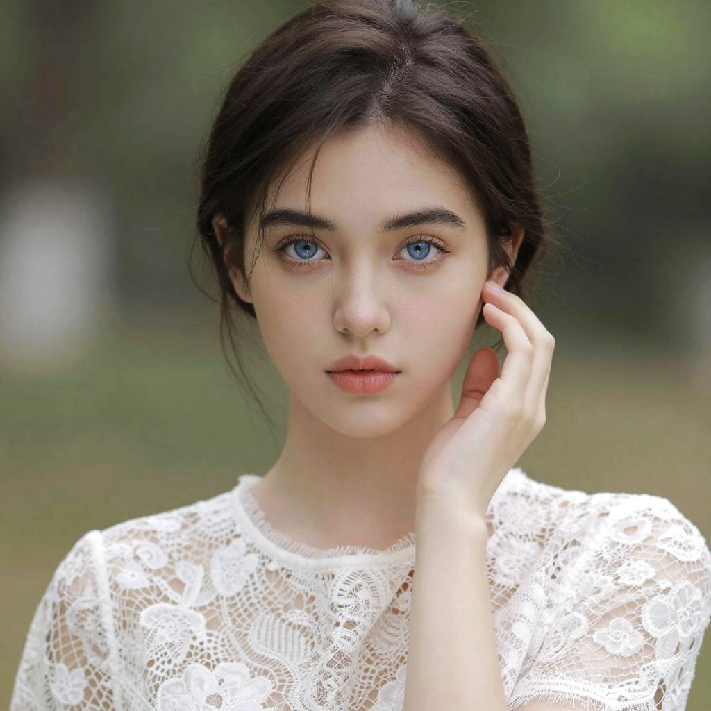 Photograph of a beautiful young woman with fair skin and wavy, dark brown hair that flows around her face. She's wearing a delicate, sheer white top with subtle embroidery and a small pendant necklace. Her blue eyes are striking, and her lips are slightly parted. The background is softly lit, creating a gentle, ethereal effect that makes her stand out. The overall vibe is elegant and dreamy.