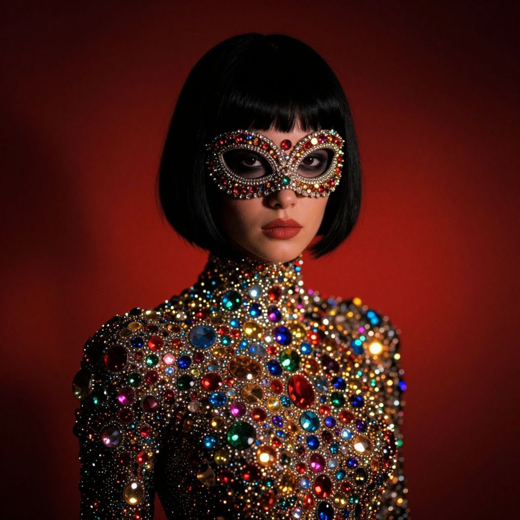 Photograph of a woman with a short black bob haircut, wearing a sparkling, multicolored masquerade mask that covers her eyes. Her lips are painted a bold red. She is dressed in a glittering, high-neck outfit adorned with numerous colorful rhinestones and sequins, creating a dazzling, jewel-encrusted effect. The background is a deep, solid red, which contrasts with her brightly decorated attire. The lighting highlights the glittering textures on her outfit and mask, giving the image a dramatic, glamorous feel. The woman's expression is neutral, and she is centered in the frame.