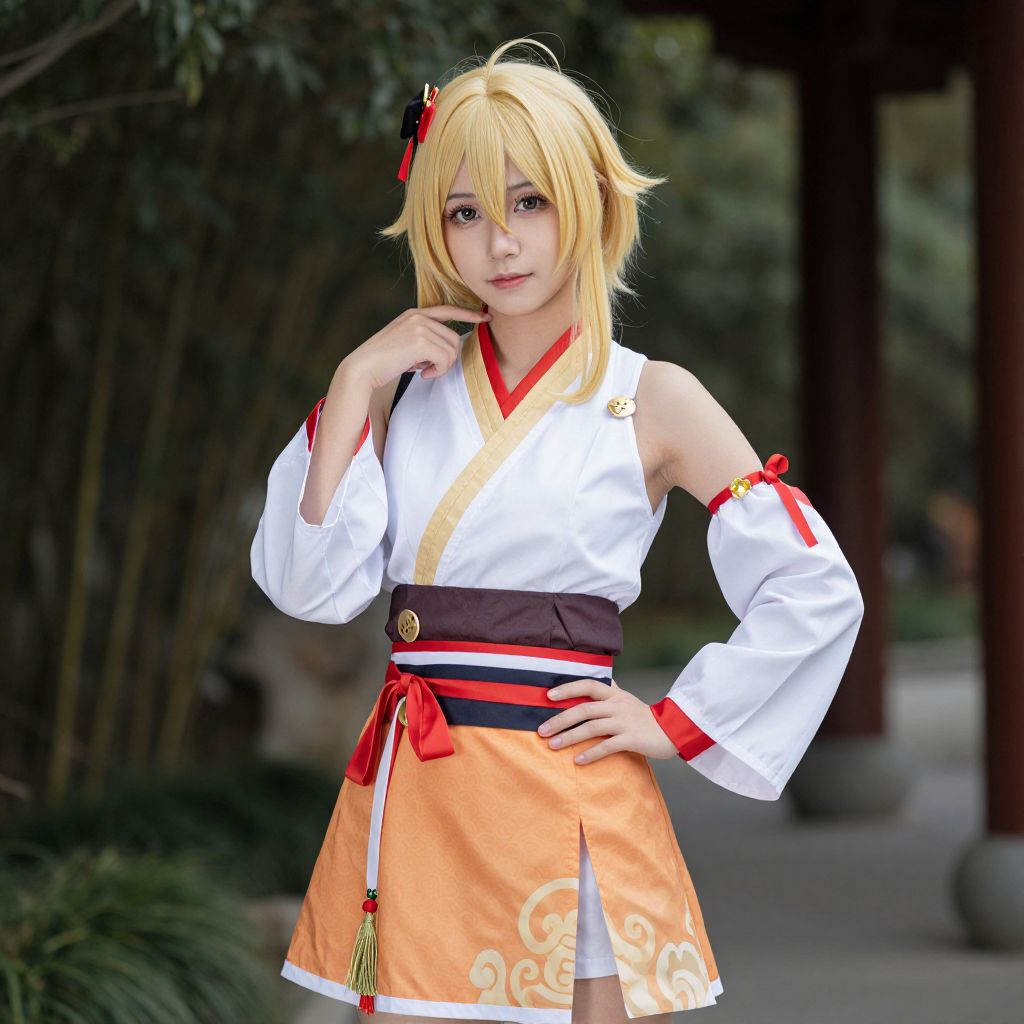 Blonde cosplayer in white and orange Japanese-inspired outfit with red accents, standing outdoors, hand on chin, forest background. Photograph.
