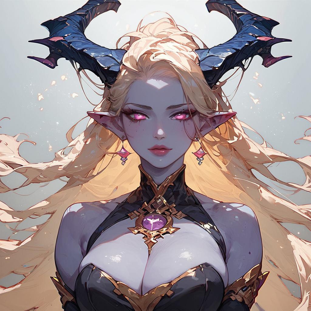 Score_9, score_8_up, score_7_up, source_anime 1girl, solo, horns, pointy ears, colored sclera, colored skin, yellow eyes, glowing eyes, grey skin, tail, tail ornament, wide hips, fantasy, outdoors, forehead mark, glowing body marks