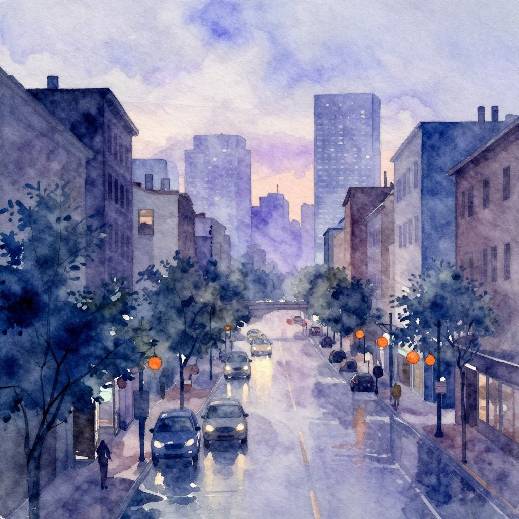 Watercolor painting of a rainy urban street at dusk, featuring cars, streetlights, trees, and tall buildings with a soft, blue-purple sky.