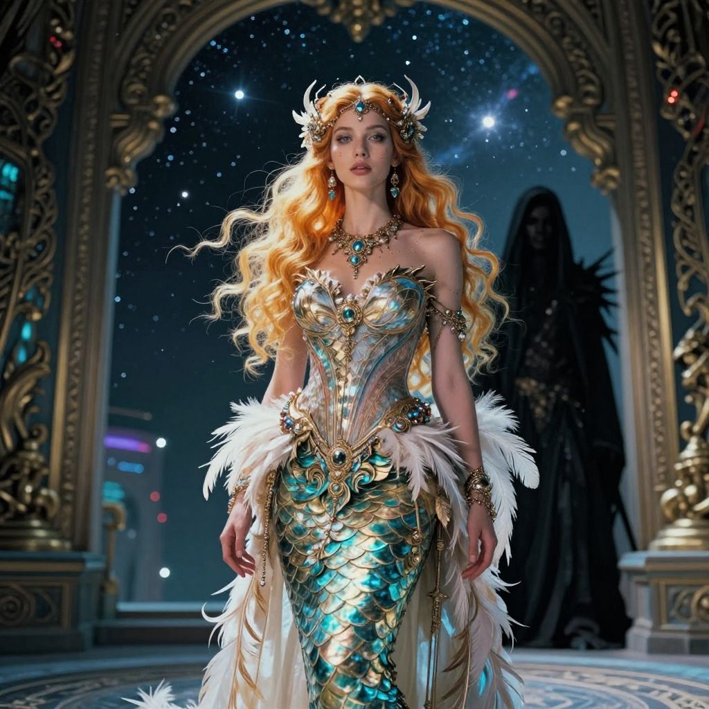 Breathtaking cinematic photo loose sketching drawing, Royalcore, Emo Art, Solargraph, Reflected light, celestial cyberpunk, intricate baroque dress, adorned with feathers, fiji celestial ethereal queen, Shady figure, Honey hair styled as Mermaid waves, 64K, Kinemacolor, dslr, A loose sketching drawing in the style of Royalcore captures the essence of Emo Art. The artwork features a solargraph depicting reflected light from a celestial body. The scene is set against a backdrop of cyberpunk aesthetics with intricate baroque architecture. In the foreground, an adorned Fiji celestial ethereal queen stands majestically, her attire embellished with delicate feathers. A shady figure lurks in the background, their honey-colored hair flowing like mermaid waves. The artwork is rendered in 64K resolution using . 35mm photograph, film, bokeh, professional, 4k, highly detailed . award-winning, highly detailed