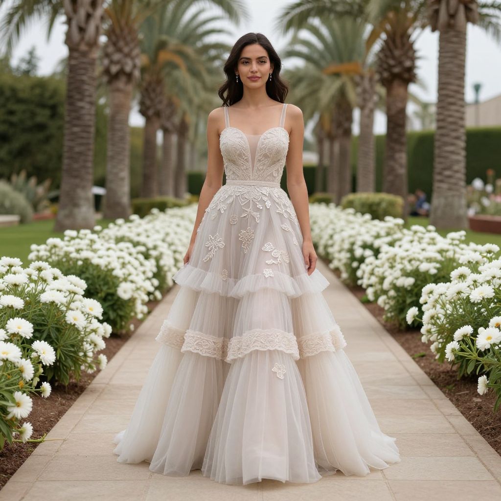 Elegant woman standing gracefully in a stunning multi-tiered tulle skirt dress adorned with intricate embroidery and appliqués, set against a picturesque garden pathway lined with vibrant white flowers and towering palm trees.