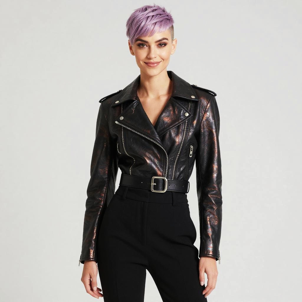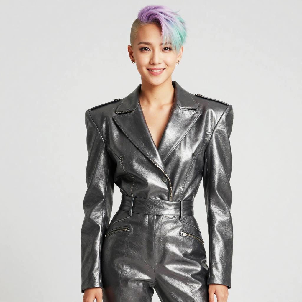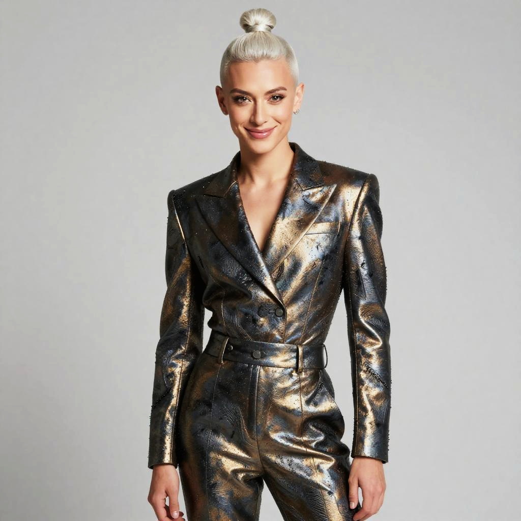 A non-binary person with shoulder-length silver-dusted dreadlocks, adorned in a avant-garde iridescent metallic asymmetrical jacket with tailored high-waist trousers. With a confident smile, they gaze directly at the lens, exuding elegance.