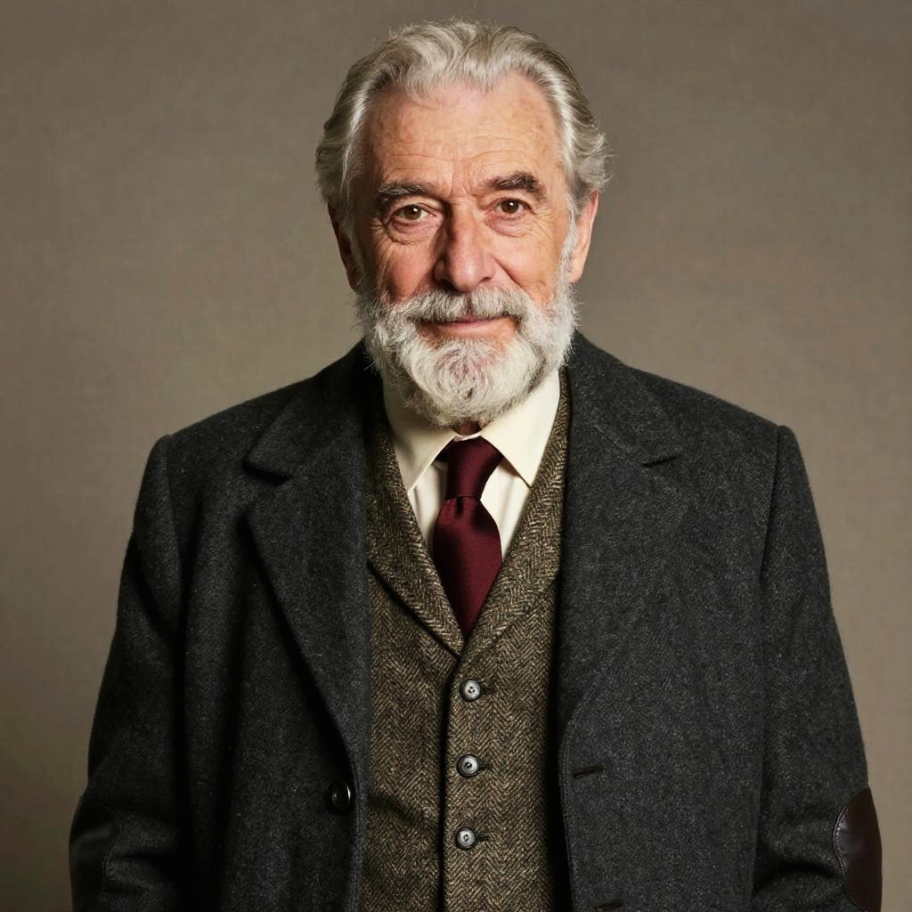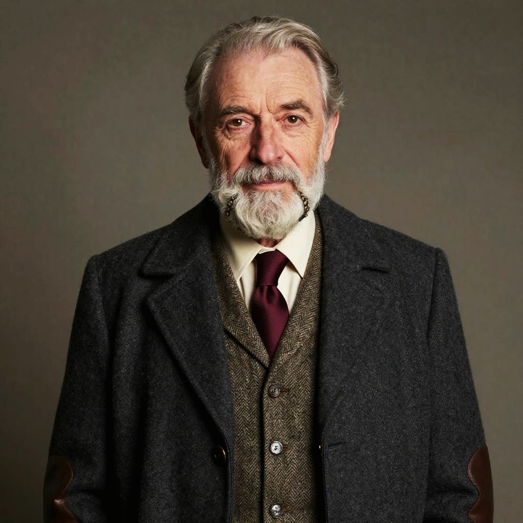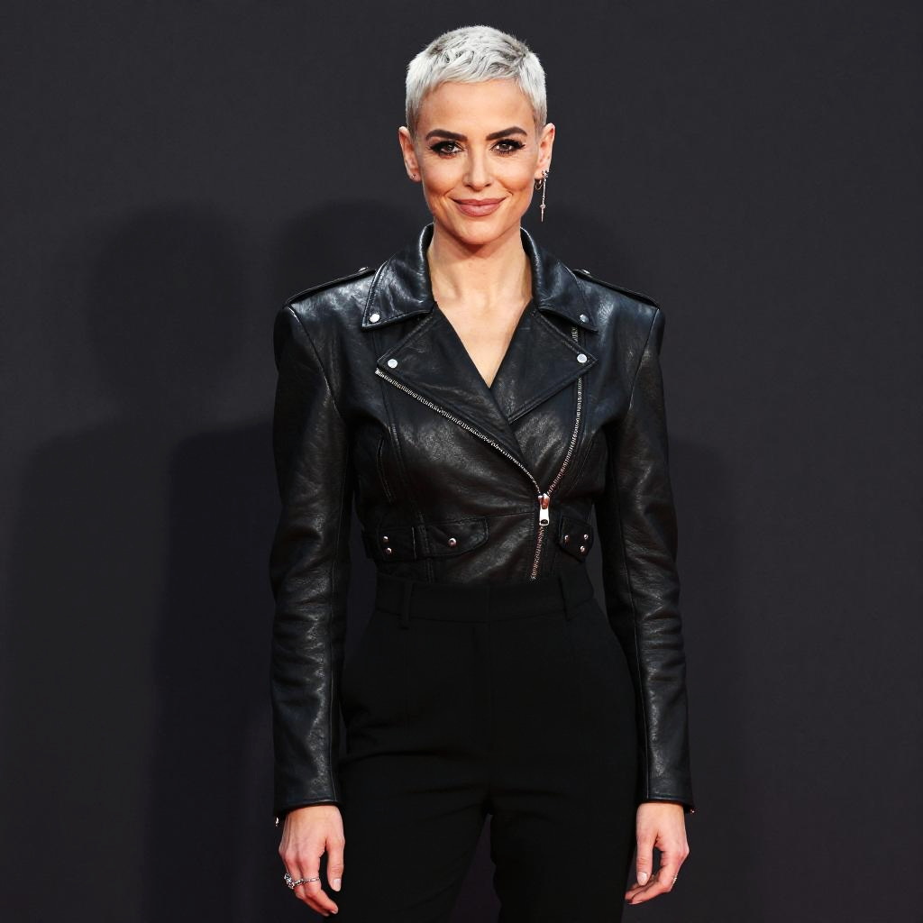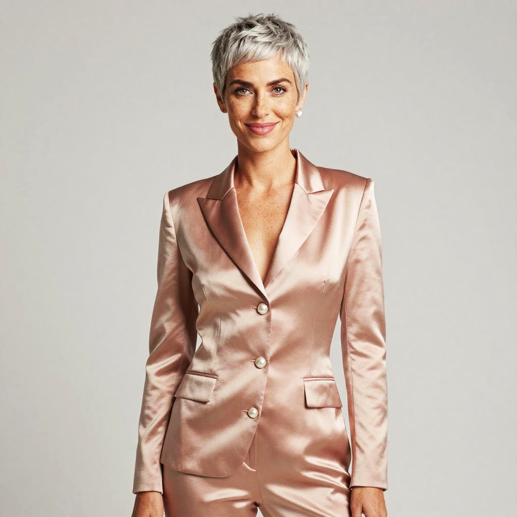 A non-binary person with shoulder-length silver-dusted dreadlocks, adorned in a avant-garde iridescent metallic asymmetrical jacket with tailored high-waist trousers. With a confident smile, they gaze directly at the lens, exuding elegance.