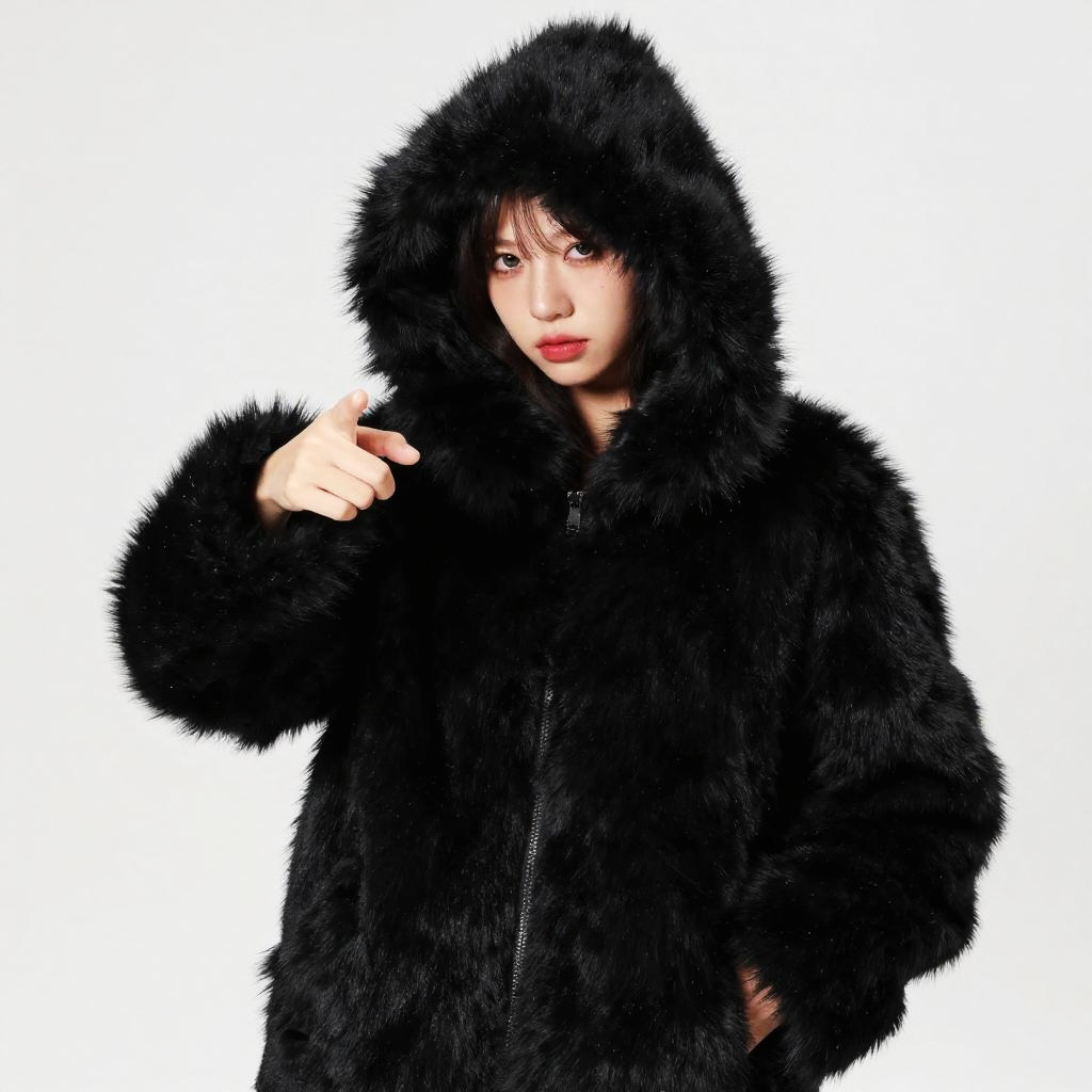 Black Fur Coat Costume, wearing a black furry coat and pointing at the camera