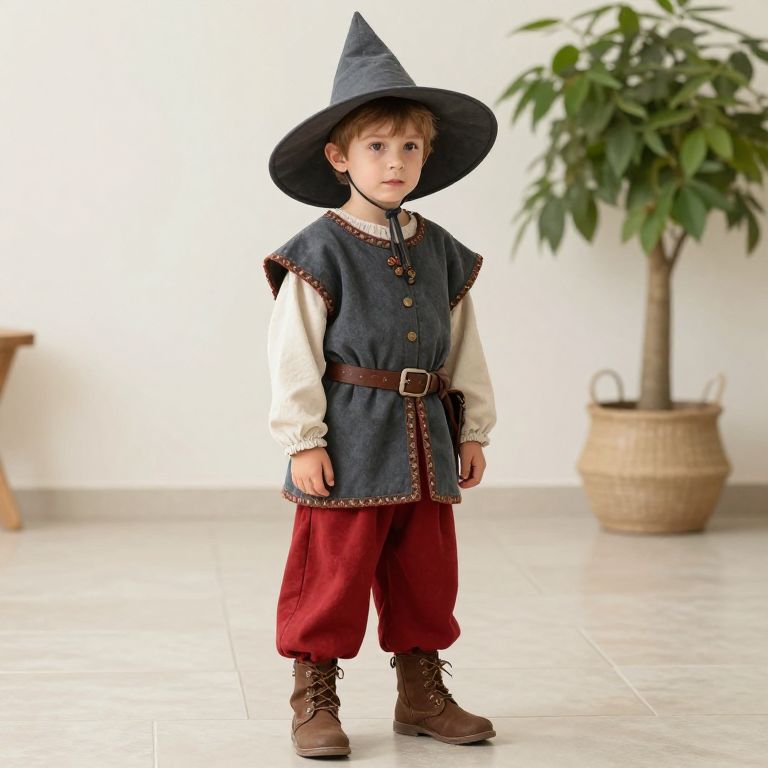 A young boy is dressed in a medieval-style outfit with a wide brimmed hat and a pair of red pants. The boy is standing on a tiled floor, and there is a potted plant in the background.
