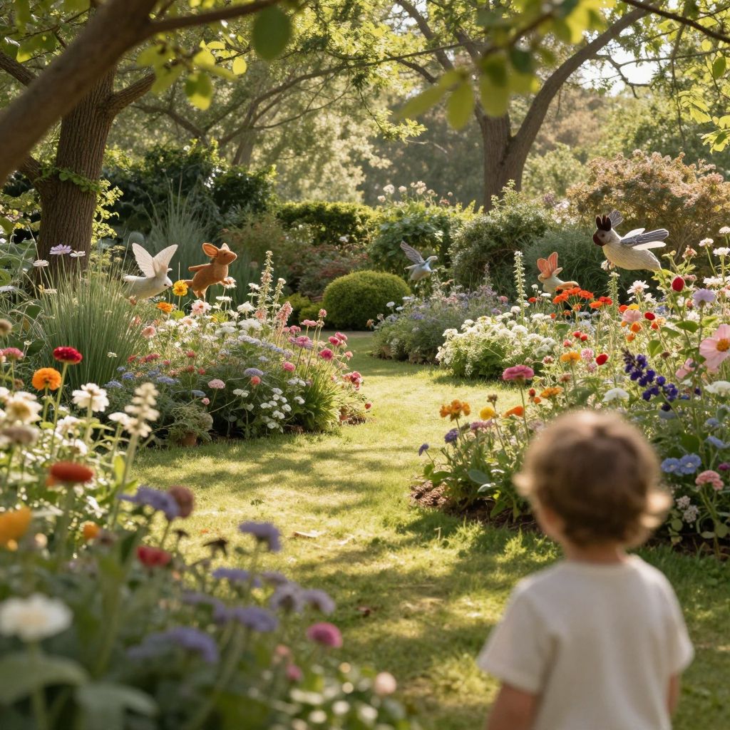 Envision an idyllic garden scene, where sunlight filters through verdant foliage in soft dapples, casting gentle shadows upon the landscape. From a child's vantage point, behold a tapestry of vibrant blooms and textured plants swaying gently in the breeze, reminiscent of both Renaissance masterpieces and vintage children's illustrations. In this enchanted haven, mythical creatures flit playfully among the flowers, their movements imbuing the scene with whimsy and wonder, inviting viewers to embrace the timeless beauty of this magical sanctuary.