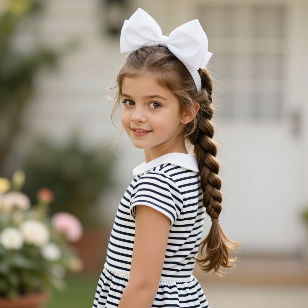 A beautiful young girl with soft, natural skin and warm brown eyes, her hair styled in neat, flowing braids that cascade down her back. She wears a classic white and black striped dress that hugs her figure with a vintage charm, and a large, delicate white bow rests securely on her head, adding a touch of elegance and playfulness. The setting is a sunny, cozy backyard with blooming flowers and a soft breeze, giving the image a joyful, nostalgic atmosphere.