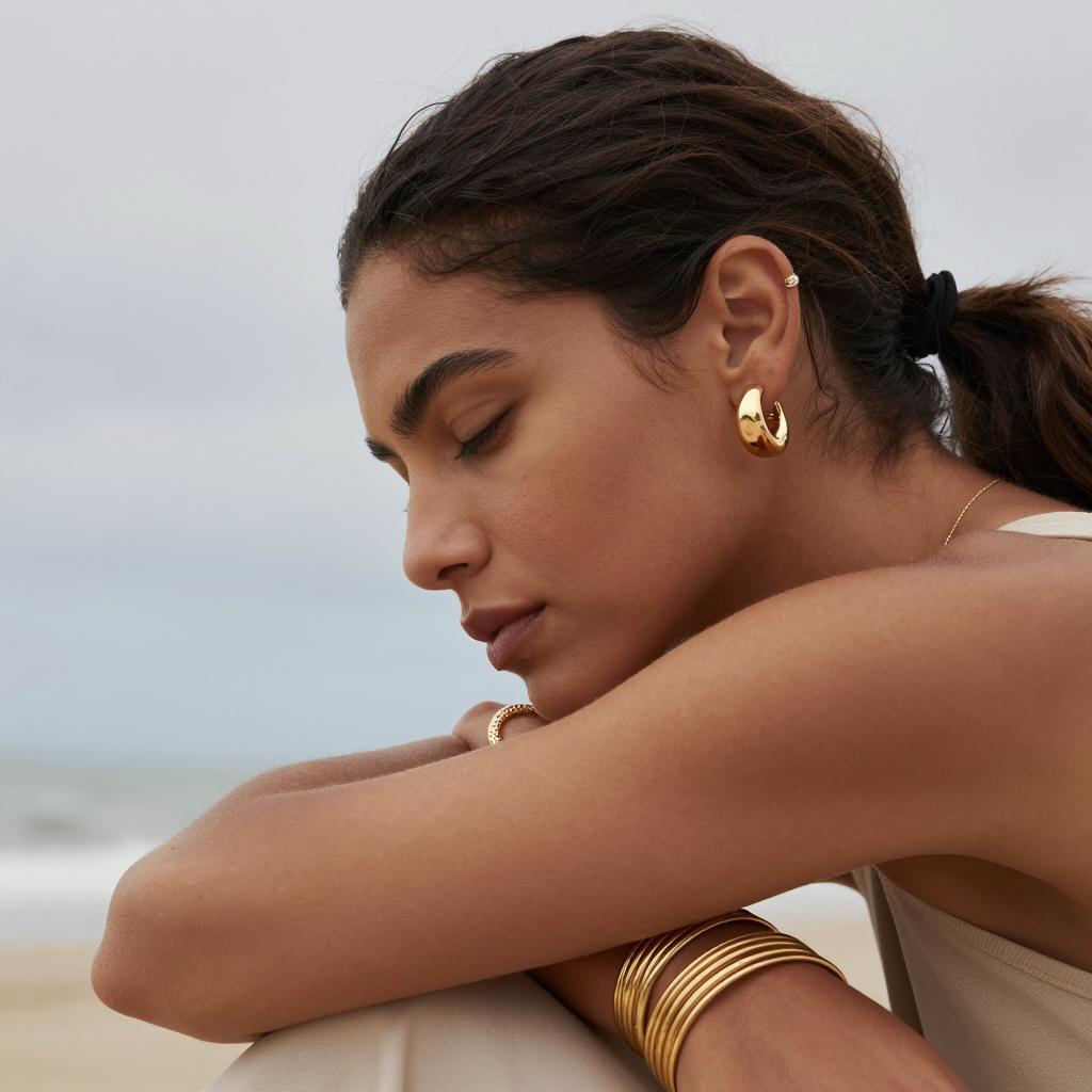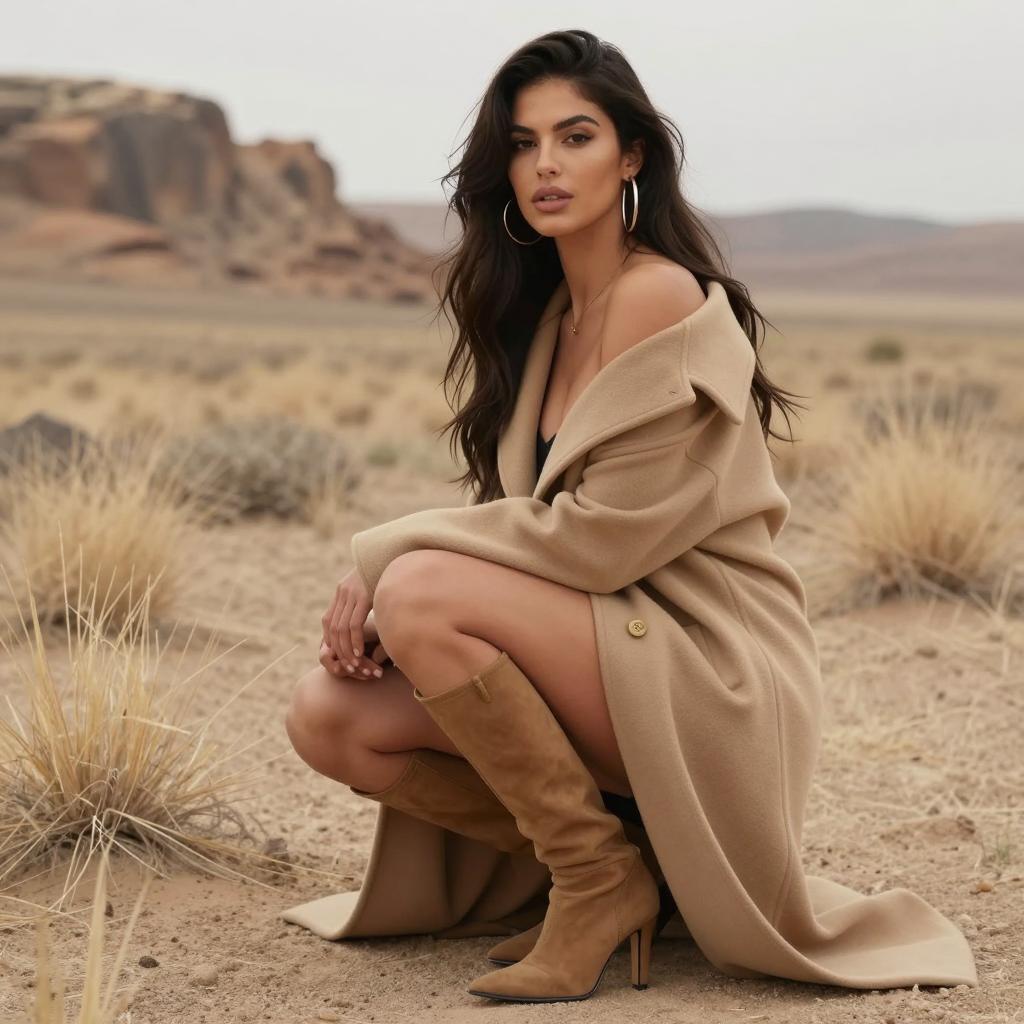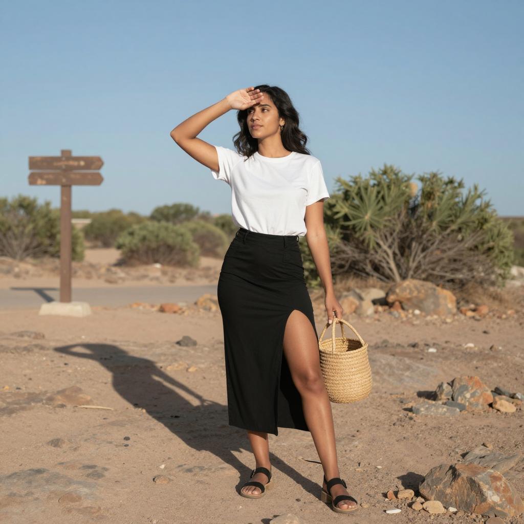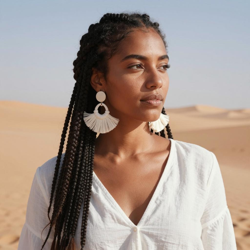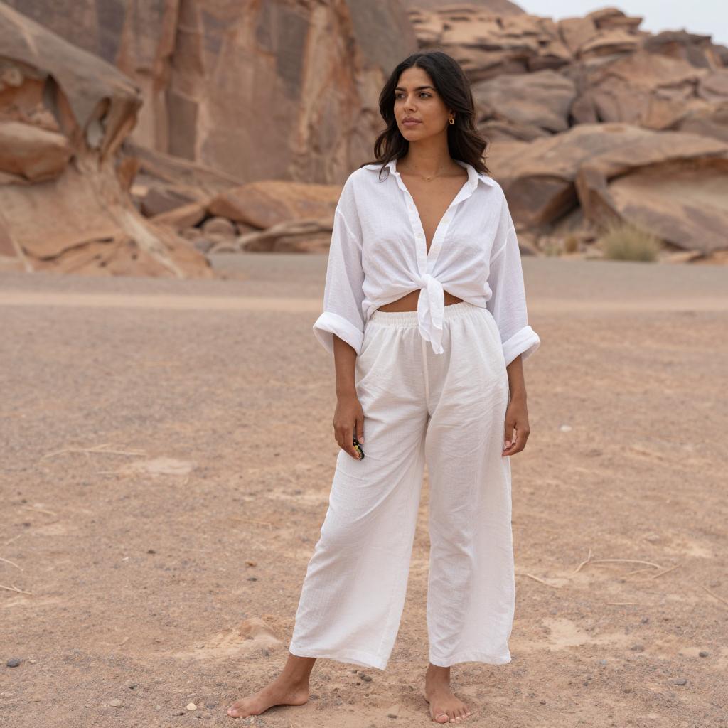 Woman with dark hair, light skin, standing in desert with rocky cliffs. She wears a white tied-up shirt and loose white pants, barefoot. She holds a small object in her right hand. She looks slightly to the right. Dry, reddish-brown terrain in background.