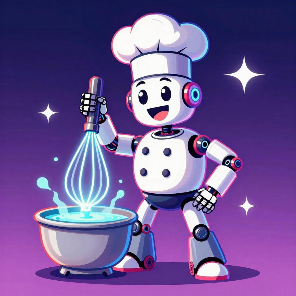 A playful caricature of robotic chef whisking a glowing electric batter rendered in retro-futuristic neon with sharp geometric lines, capturing comic energy and creative flair.