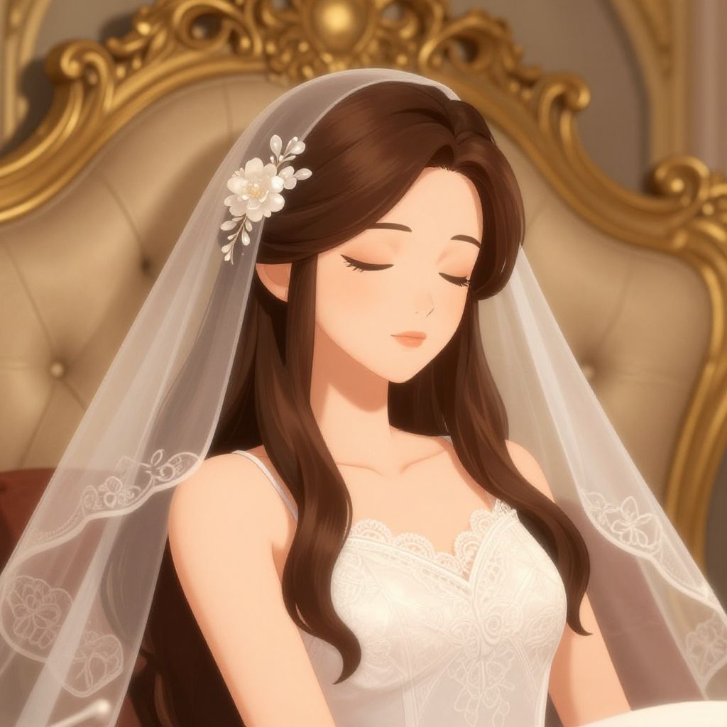 Digital illustration of an anime-style young woman with long brown hair, resting calmly with a serene expression. She wears a white wedding veil decorated with floral hairpins and a delicate lace sundress. The backdrop features an ornate golden headboard and softly lit gothic-inspired decor, creating a tranquil and ethereal atmosphere.