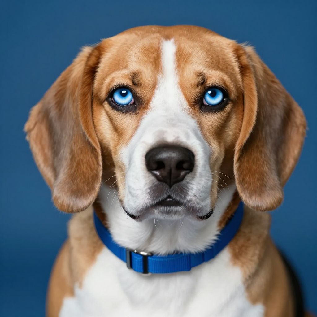 Photograph of a Beagle dog with a white and brown coat, featuring large, expressive, bright blue eyes that stand out against the blue background. The dog has floppy ears and a black nose, with a white stripe running down its face. It wears a blue collar and looks directly at the camera with a slightly serious expression. The background is a solid, deep blue, creating a contrast with the dog's fur and eyes. The image is sharply focused, emphasizing the dog's features and the vivid color of its eyes.