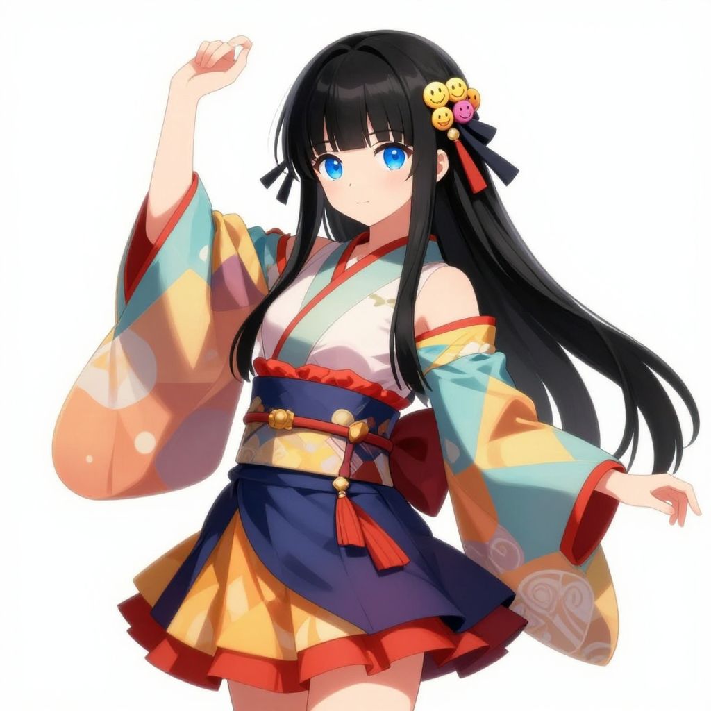 Digital illustration of an anime girl with long black hair and blunt bangs, styled with multiple ties and adorned with a decorative hairband featuring various emoticon faces. She has large blue eyes and is dressed in a multicolored traditional Japanese outfit with wide, long sleeves and a layered dress. The artwork showcases a graceful pose with one arm raised and the other extended to the side.