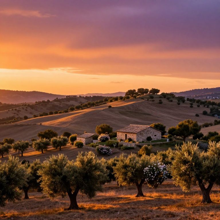 Andalou landscape at sunset, vibrant orange and purple skies over rolling hills dotted with olive trees, rustic stone cottages nestled among flowering shrubs, a peaceful rural scene with warm golden light, detailed textures in leaves and earth, soft shadows