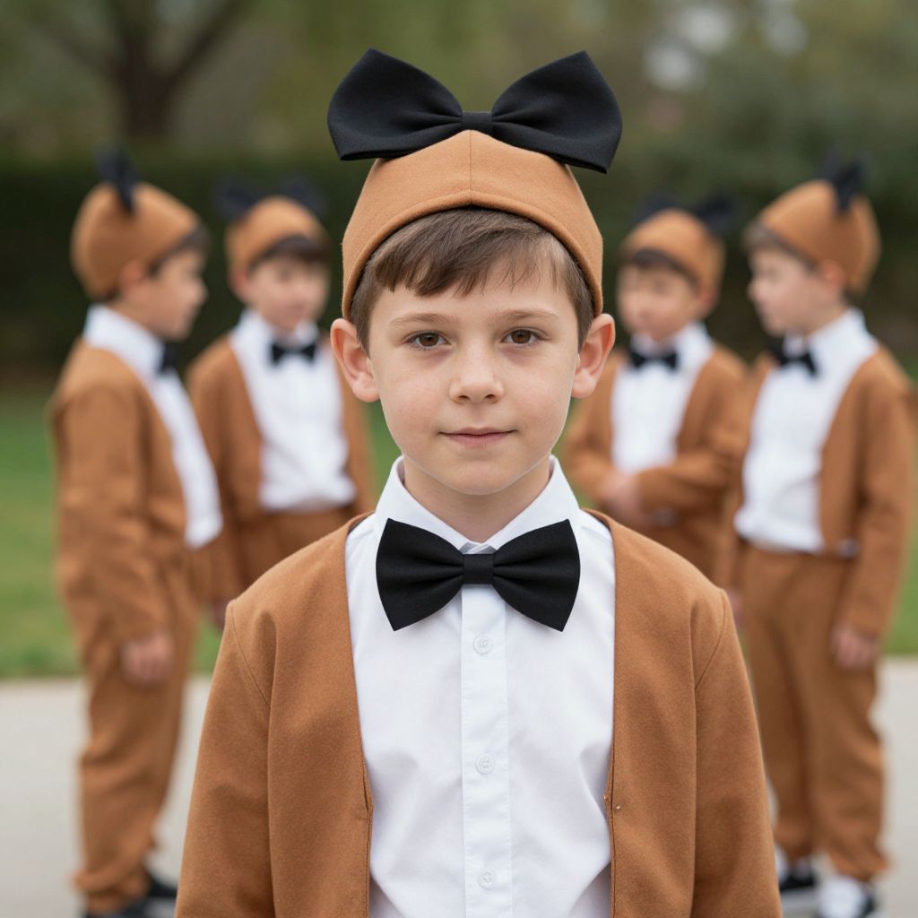 Photograph of a young boy in a brown bear costume with a black bowtie and hat, standing in front of four blurred boys in similar costumes,