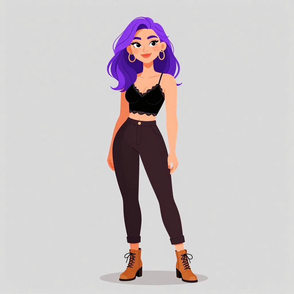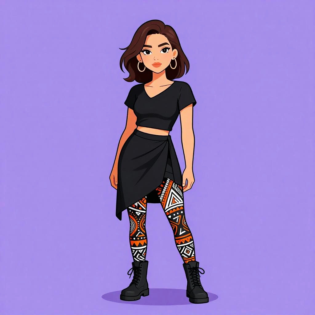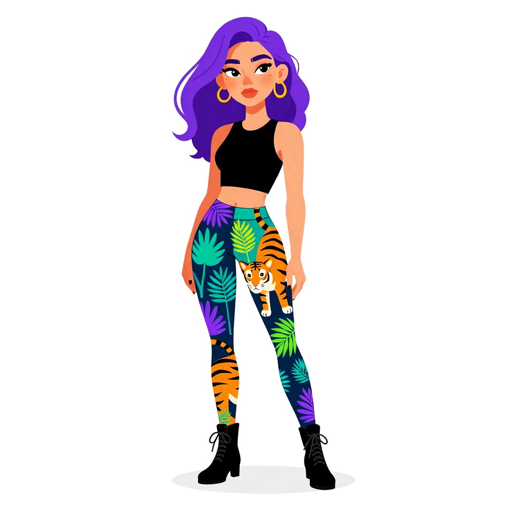 Woman with pretty face and pretty hair. Woman, eclectic style, black sleeveless crop top, high-waisted leggings with vibrant forest and tiger print, ankle-length, black lace-up ankle boots, white background. --sref 1467