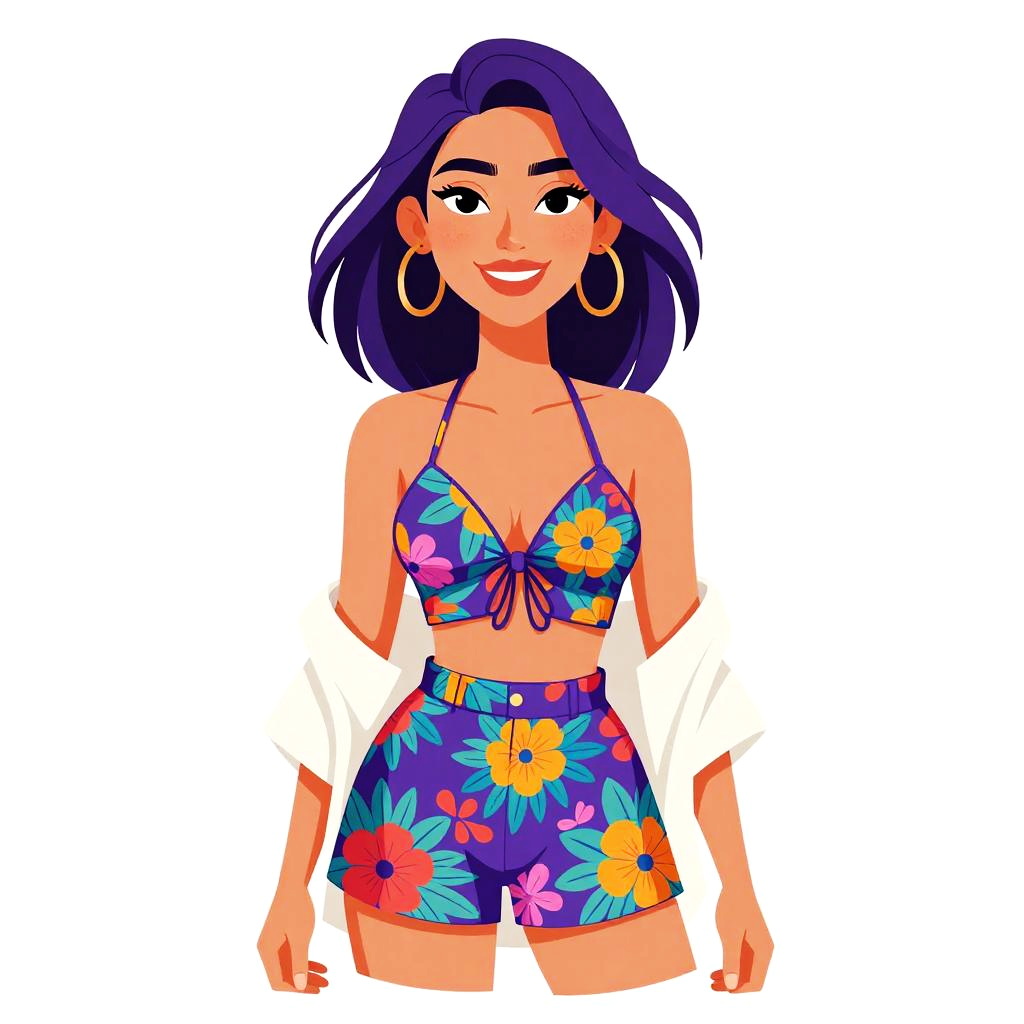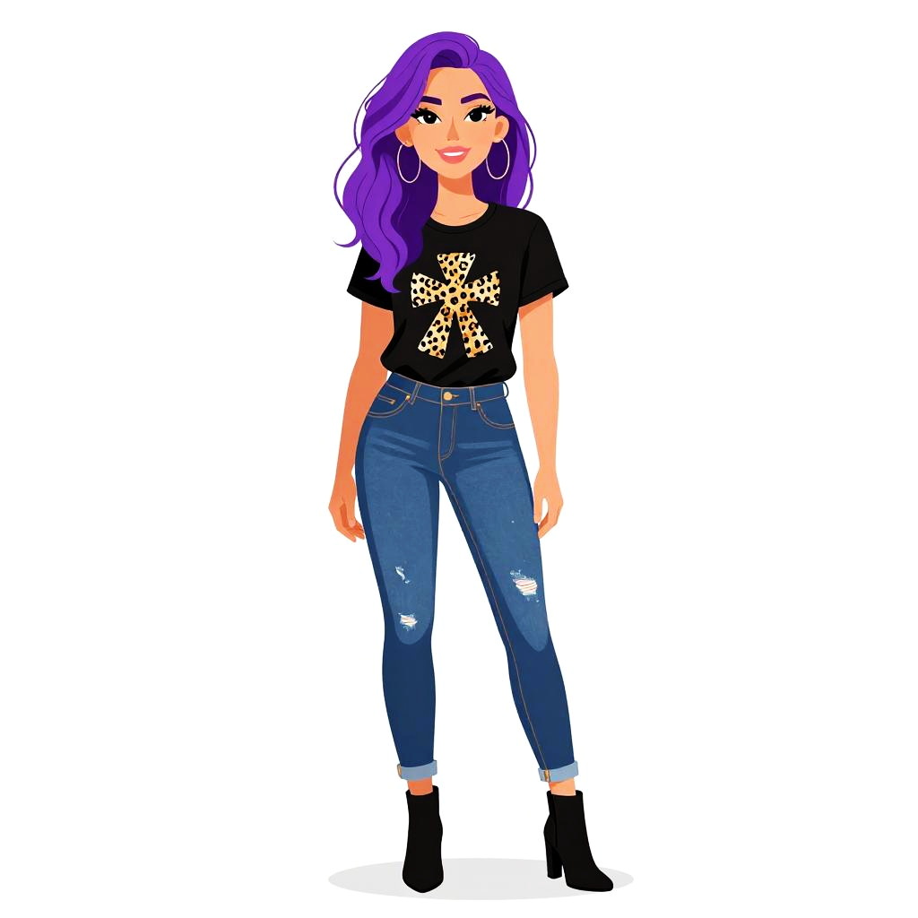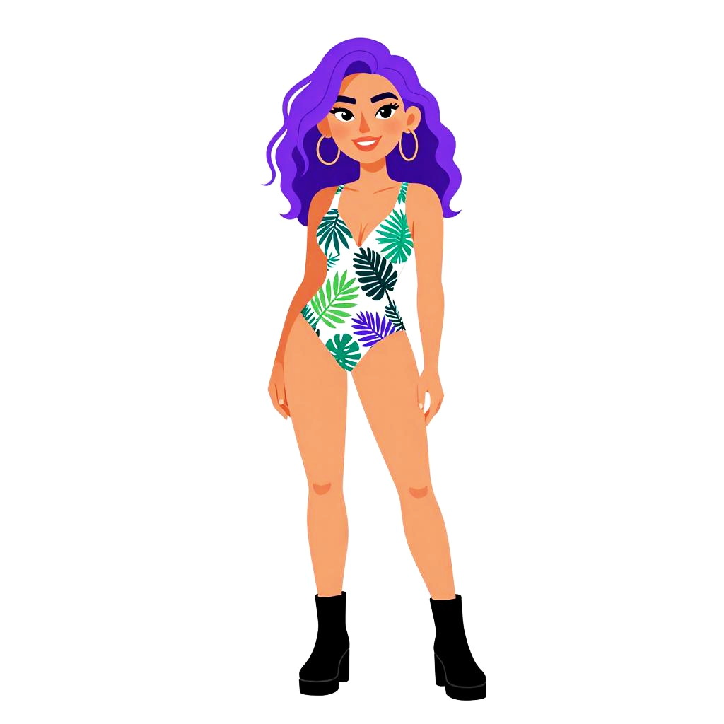 Woman with pretty face and pretty hair. Woman, eclectic style, black sleeveless crop top, high-waisted leggings with vibrant forest and tiger print, ankle-length, black lace-up ankle boots, white background. --sref 1467