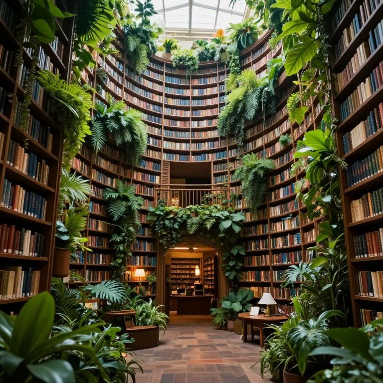 Photograph of an opulent, circular library with towering, dark wooden bookshelves lined with numerous books, extending upwards to a glass skylight. Lush green foliage, including ferns and hanging plants, decorates the shelves and floor. The central aisle is flanked by wooden reading lamps and small tables. Warm lighting from wall sconces illuminates the space, creating a serene, scholarly ambiance. The tiled floor and rich, wooden textures contrast with the vibrant greenery, enhancing the library's elegant, yet natural atmosphere.
