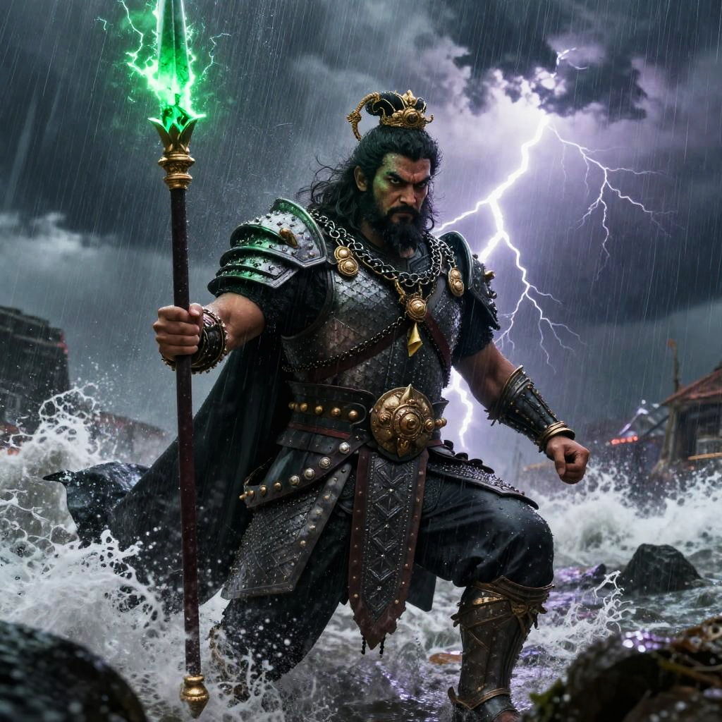 Indra – King of the gods, god of thunder and rain, portrayed as a regal deity cloaked in night-dark velvet adorned with radiant lightning seals, set in the twilight skies above the sacred peaks, kissed by ephemeral lightning.